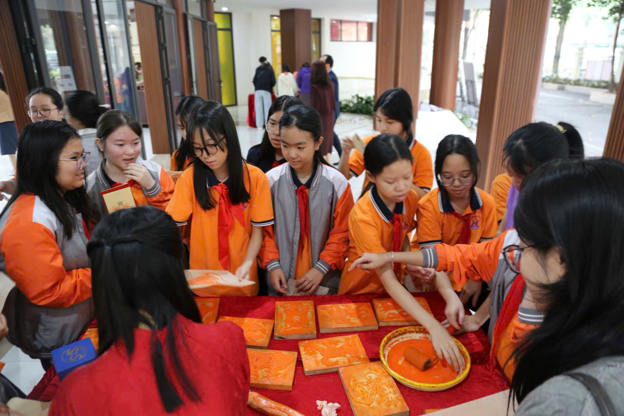 - Lưu dấu Mộc bản: Dưới sự hướng dẫn của các chuyên gia, các em học sinh lớp 6A6 cùng các thầy cô giáo sinh thực tập đã hào hứng trải nghiệm kỹ thuật in dập mộc bản trên giấy dó, tự tay tạo nên những bản in kỷ niệm độc đáo.