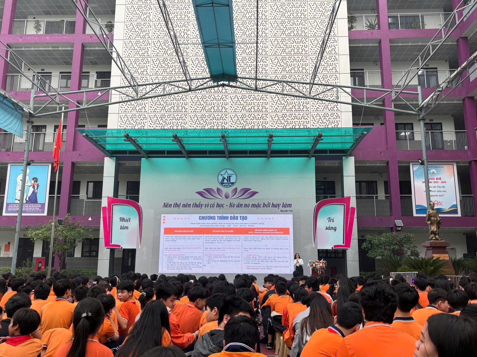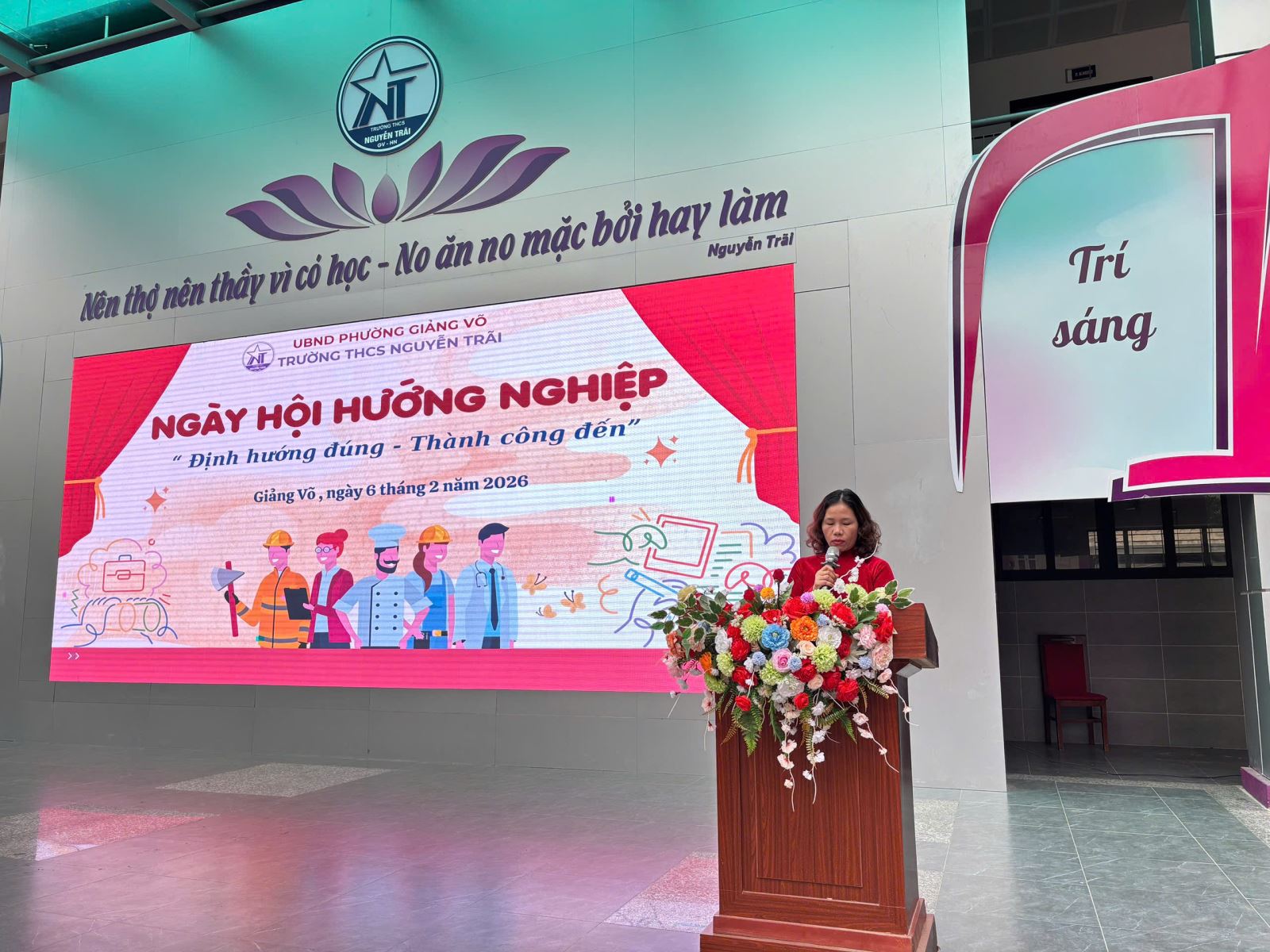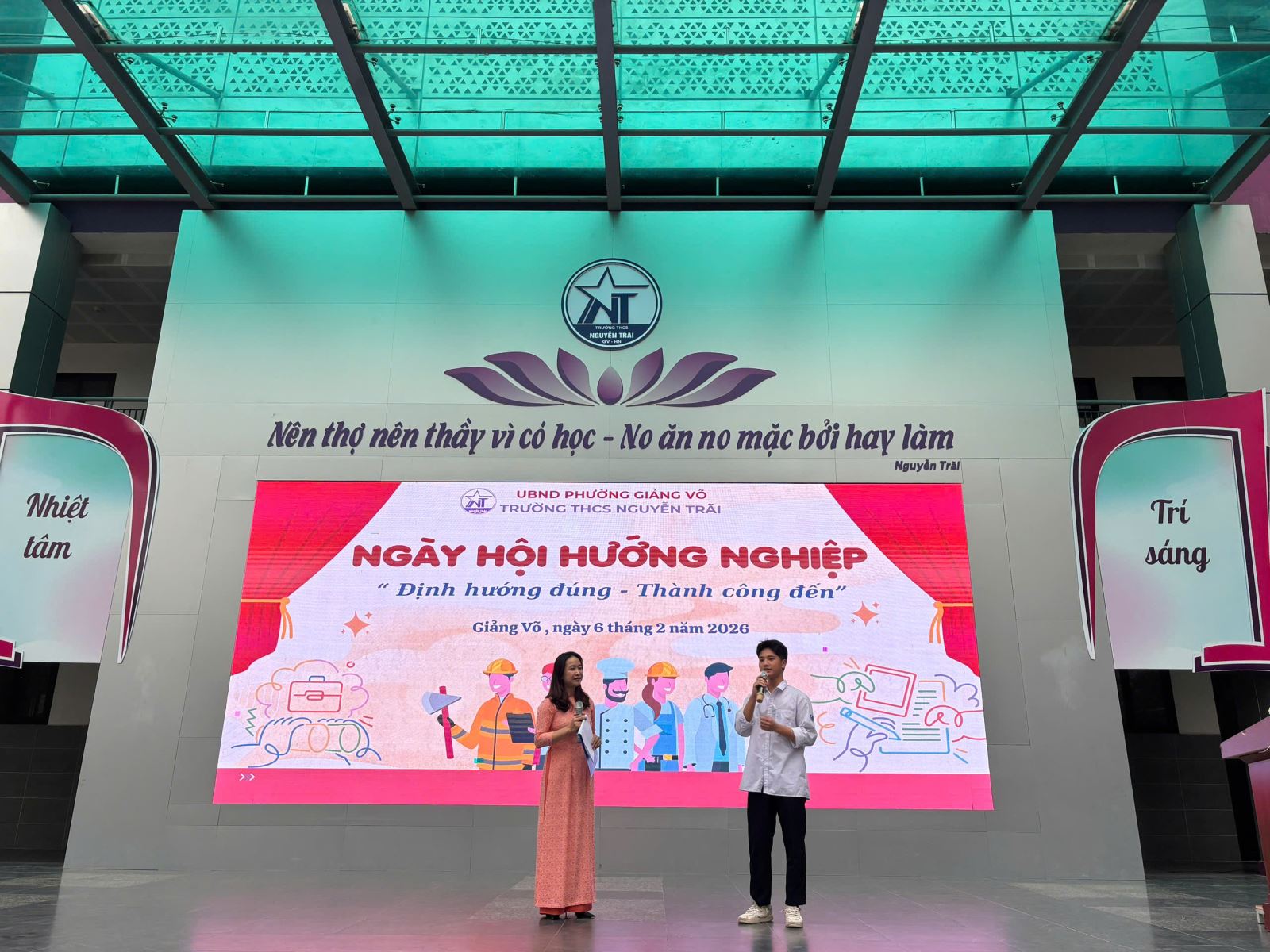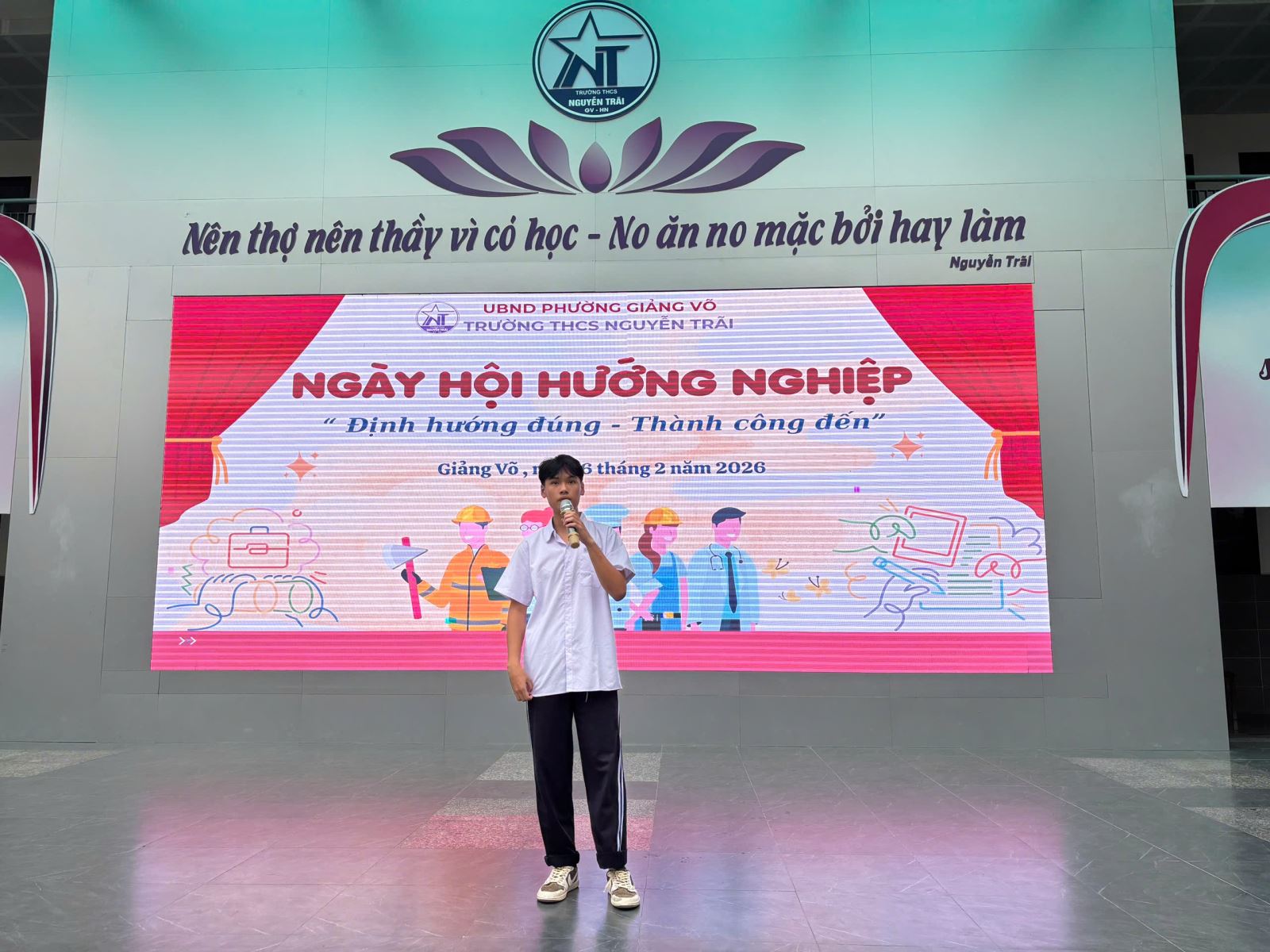 Chiều ngày 06/02/2026, Trường THCS Nguyễn Trãi – Giảng Võ đã tổ chức chương trình Hướng nghiệp dành cho học sinh khối 9 với sự tham gia của Ban Giám hiệu nhà trường, các bậc phụ huynh, đại diện các trường THPT, trung cấp, cao đẳng nghề và đông đảo học sinh khối 8, 9. Chương trình nhằm giúp học sinh có cái nhìn toàn diện về các hướng đi sau khi tốt nghiệp THCS, từ đó lựa chọn con đường học tập phù hợp với năng lực và nguyện vọng của bản thân.