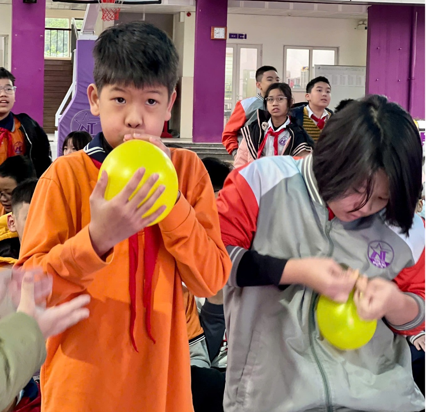 Đặc biệt, màn cứu trợ là phần được mong chờ và hồi hộp nhất của chương trình. Các bạn học sinh đã phối hợp nhịp nhàng cùng giáo viên chủ nhiệm trong thử thách thổi và làm nổ bóng cứu trợ. Mỗi quả bóng được làm nổ thành công tương ứng với một học sinh được quay trở lại sàn thi đấu, mang đến niềm vui vỡ òa và tiếp thêm cơ hội cho các thí sinh tiếp tục chinh phục những câu hỏi phía sau. Những tiếng cổ vũ vang dội khắp sân trường đã tạo nên bầu không khí vô cùng sôi động, thể hiện tinh thần đoàn kết và gắn bó giữa thầy và trò.