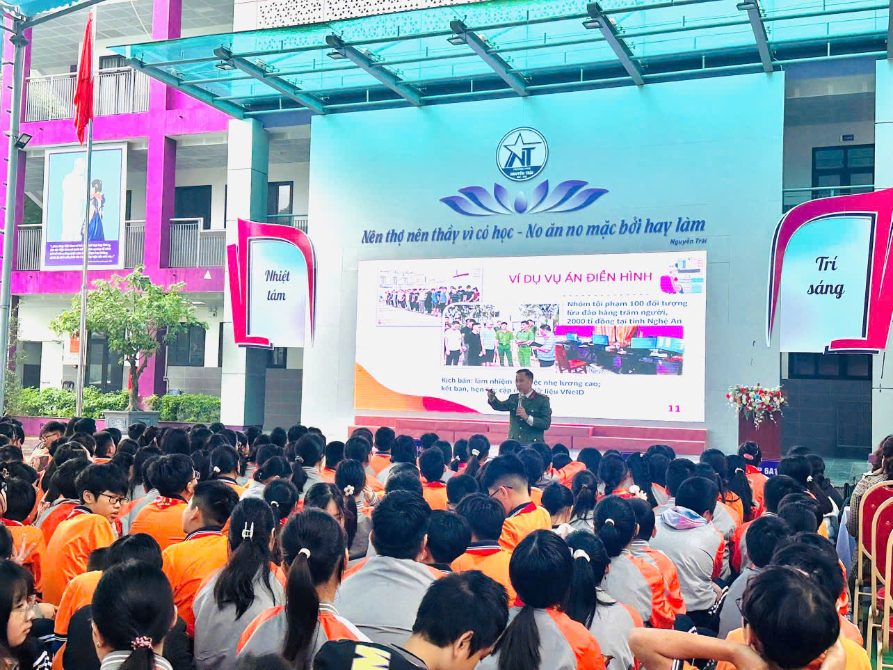 Sáng ngày 7 tháng 11 năm 2025, tại trường THCS Nguyễn Trãi đã diễn ra buổi tuyên truyền với chủ đề “Sử dụng Internet, mạng xã hội an toàn, văn minh, đúng pháp luật – Phòng tránh lừa đảo và bắt cóc online trên không gian mạng” cho học sinh các khối lớp.
