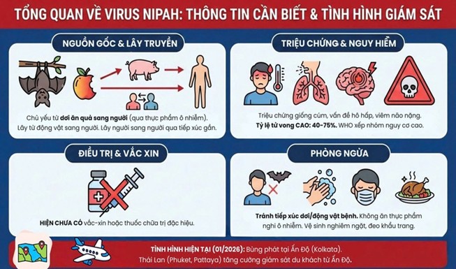 Theo hệ thống giám sát bệnh truyền nhiễm, từ ngày 27/12/2025 đến ngày 26/01/2026, Ấn Độ đã ghi nhận 05 trường hợp nghi ngờ mắc bệnh do vi rút Nipah, trong đó có 02 trường hợp được xét nghiệm khẳng định, tại một bệnh viện thuộc bang Tây Bengal. Thông tin này cho thấy nguy cơ dịch bệnh tiếp tục lưu hành và có khả năng lan sang các quốc gia khác thông qua giao lưu, đi lại quốc tế.