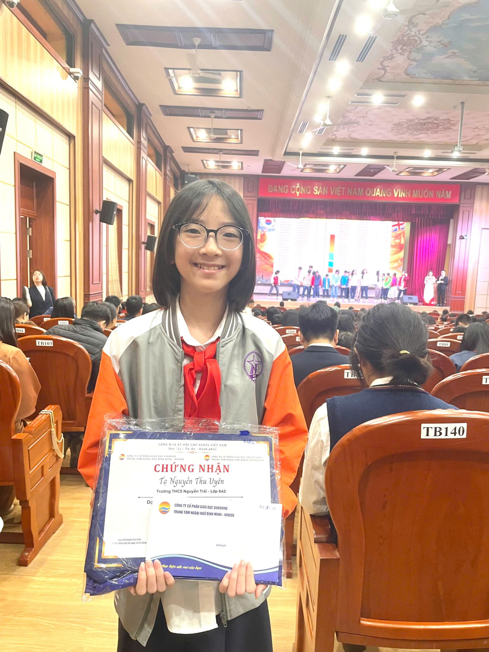 Trong khuôn khổ chương trình, bạn Tạ Nguyễn Thu Uyên, học sinh lớp 6A2, lớp song ngữ Anh – Nhật, đã vinh dự được trao danh hiệu Học sinh tiêu biểu học kì I. Đây là kết quả xứng đáng cho quá trình nỗ lực, cố gắng nghiêm túc của bạn trong suốt học kì vừa qua.