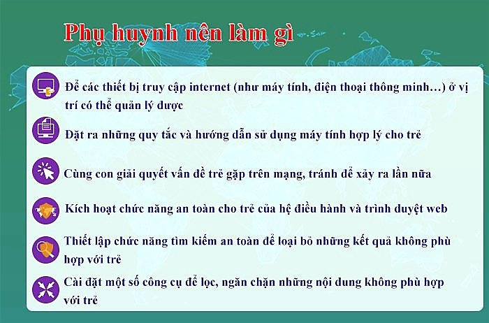 Hướng dẫn trẻ sử dụng Internet an toàn Cha mẹ không thể kiểm soát và quản lý con cái 24/7. Biện pháp hữu hiệu hơn là dạy trẻ cách dùng mạng xã hội một cách an toàn, lành mạnh. Infographic dưới đây gợi ý một số bí quyết giúp cha mẹ bảo vệ trẻ khi tiếp xúc với mạng Internet: