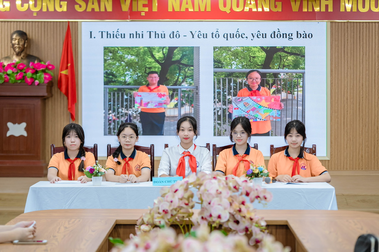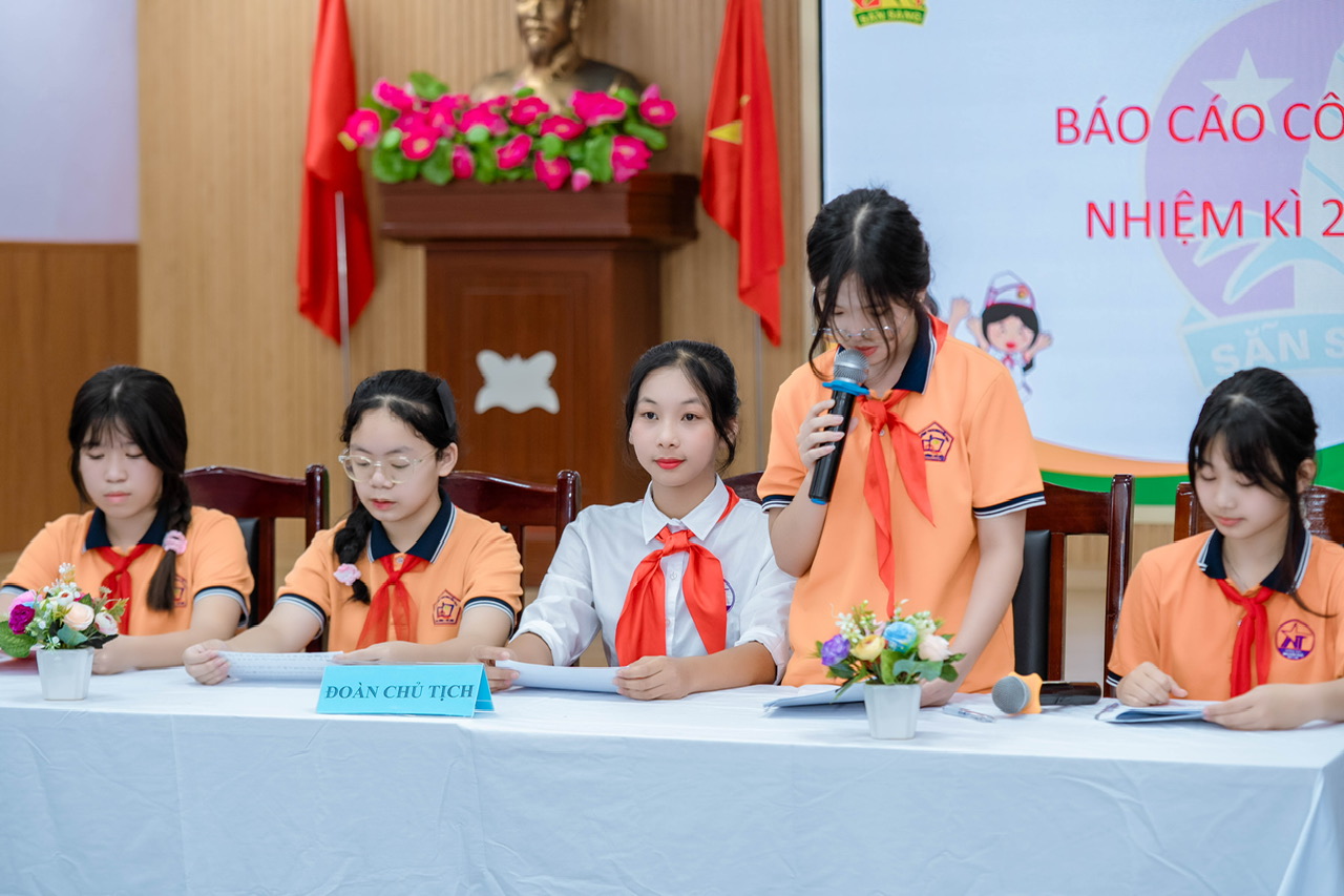 Trong không khí sôi nổi, bạn Vũ Thu Phương – Chi đội 8A3 thay mặt Đoàn Chủ tịch trình bày báo cáo tổng kết nhiệm kỳ 2024 – 2025. Đại hội đã nhìn lại những thành tích đáng tự hào của Liên đội qua phần thuyết trình sinh động và video tổng kết đầy cảm xúc.