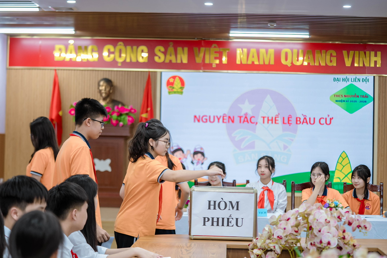 Tiếp đó, Đại hội tiến hành bầu Ban Chỉ huy Liên đội nhiệm kỳ 2025 – 2026 trong không khí dân chủ, nghiêm túc. Xen kẽ chương trình là những tiết mục văn nghệ và trò chơi vui tươi do Chi đội 9A4 biểu diễn, mang đến sắc màu tươi mới, khơi dậy tinh thần đoàn kết, phấn khởi trong toàn Liên đội.