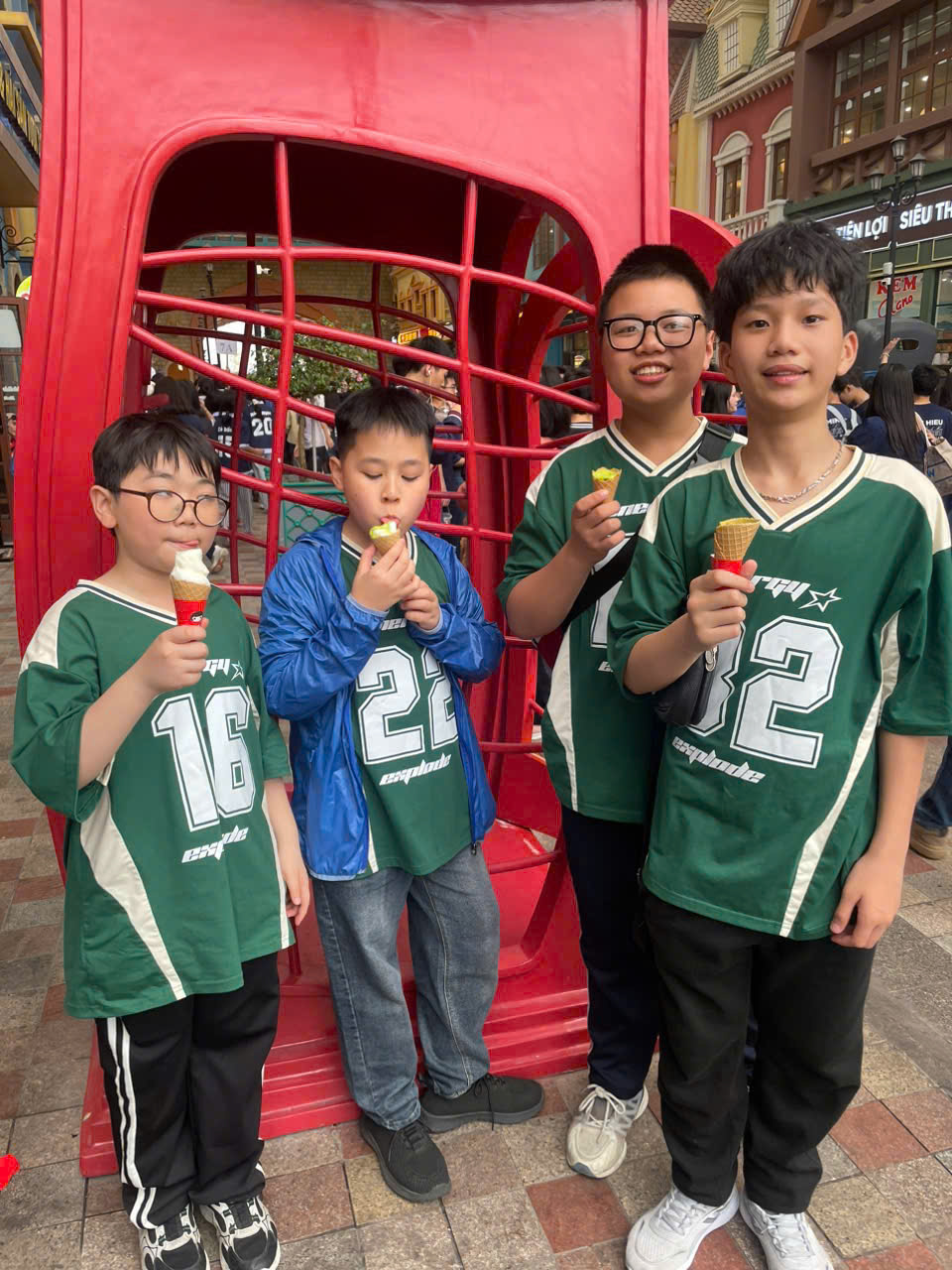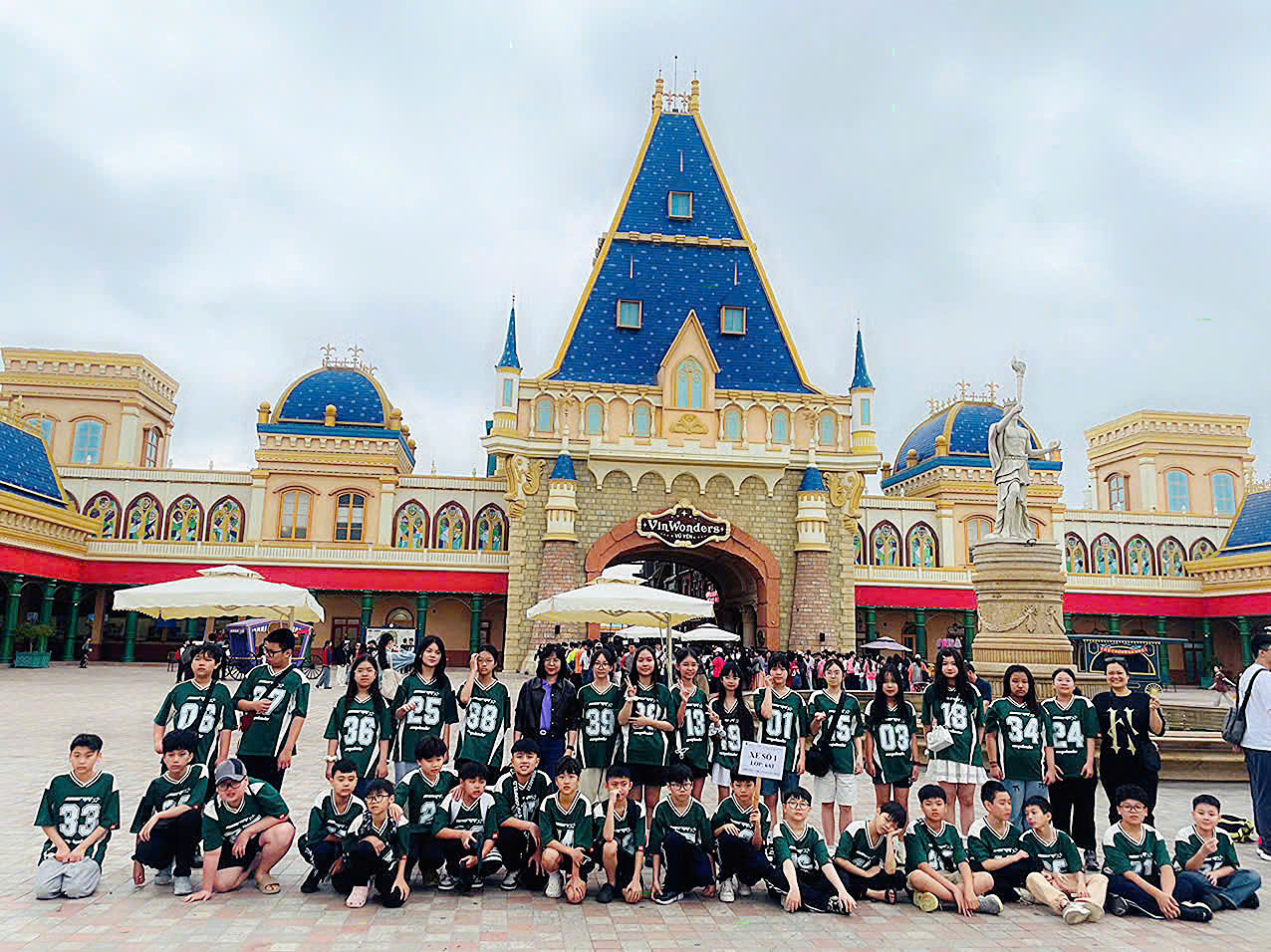 Đặt chân đến VinWonders Vũ Yên, các em như bước vào một thế giới cổ tích đầy sắc màu với những công trình kiến trúc độc đáo và không gian rộng lớn, hiện đại. Điểm dừng chân đầu tiên là khu vực lâu đài tráng lệ – nơi cả lớp cùng cô giáo chủ nhiệm và các bậc phụ huynh lưu giữ những khoảnh khắc đẹp. Trong sắc áo đồng phục, từng gương mặt rạng rỡ, ánh mắt lấp lánh niềm vui đã tạo nên một bức tranh tập thể đầy ấm áp và yêu thương.