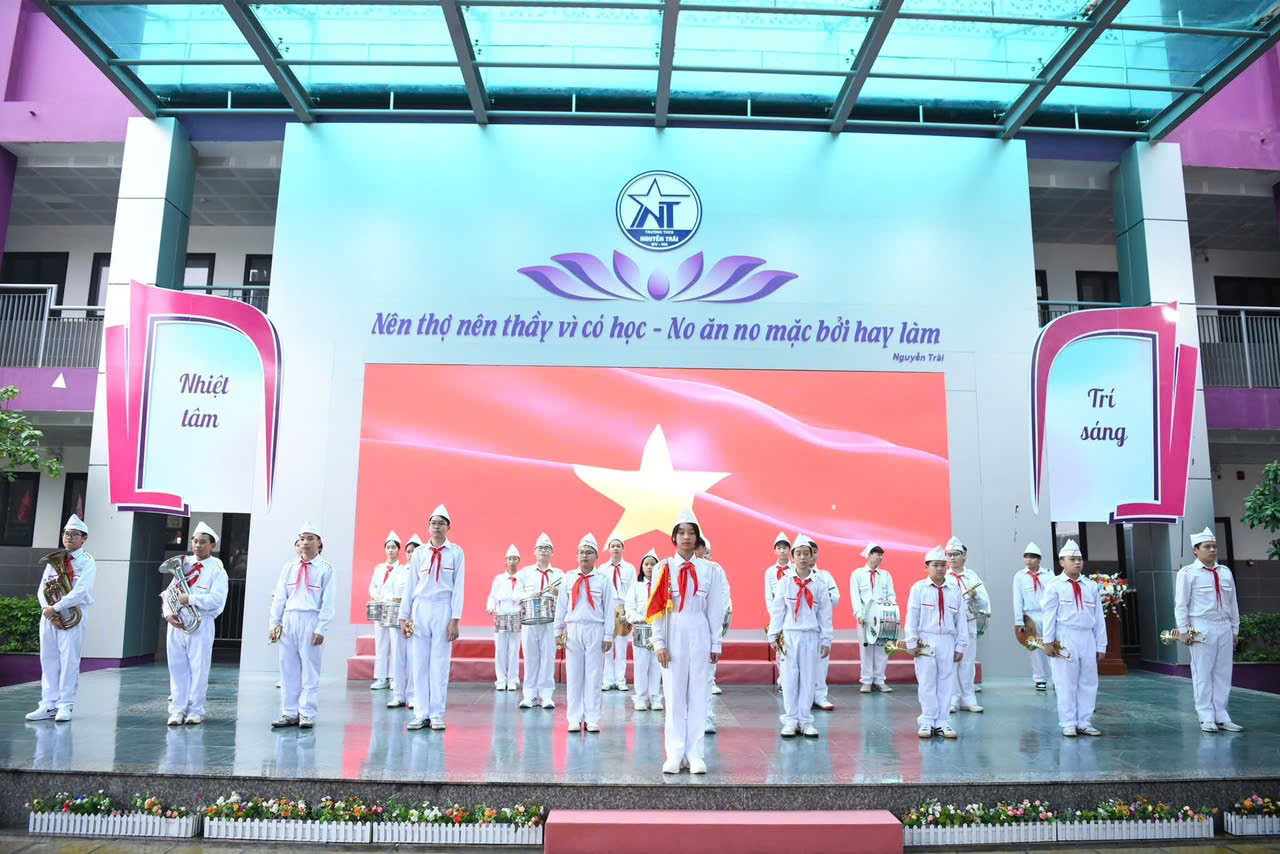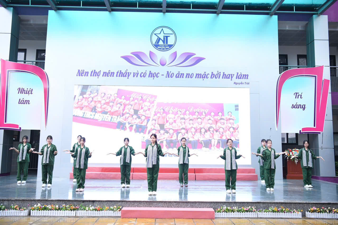 Ngay sau đó là tiết mục dân vũ “Việt Nam tỏa sáng những ước mơ” do các bạn lớp 8A2 và 8A3 biểu diễn. Những động tác khỏe khoắn, dàn đồng phục rực rỡ cùng nụ cười tươi sáng của các bạn khiến cả sân trường như bừng lên sức sống.