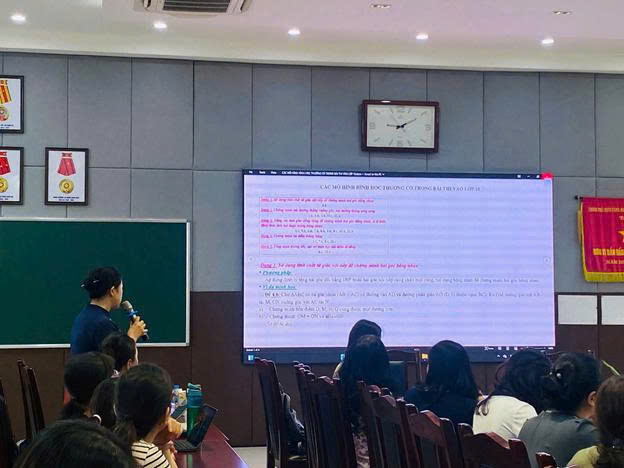Đặc biệt, trong phần trao đổi, đội ngũ giáo viên của trường THCS Nguyễn Trãi cũng đã chia sẻ kinh nghiệm ôn tập chuyên sâu về phần Hình học. Các thầy cô đã cùng nhau phân tích các dạng bài tập khó, các phương pháp giải độc đáo, từ đó đưa ra những chiến lược ôn tập hiệu quả để giúp học sinh tự tin chinh phục những câu hỏi khó và mang tính phân loại cao trong đề thi.