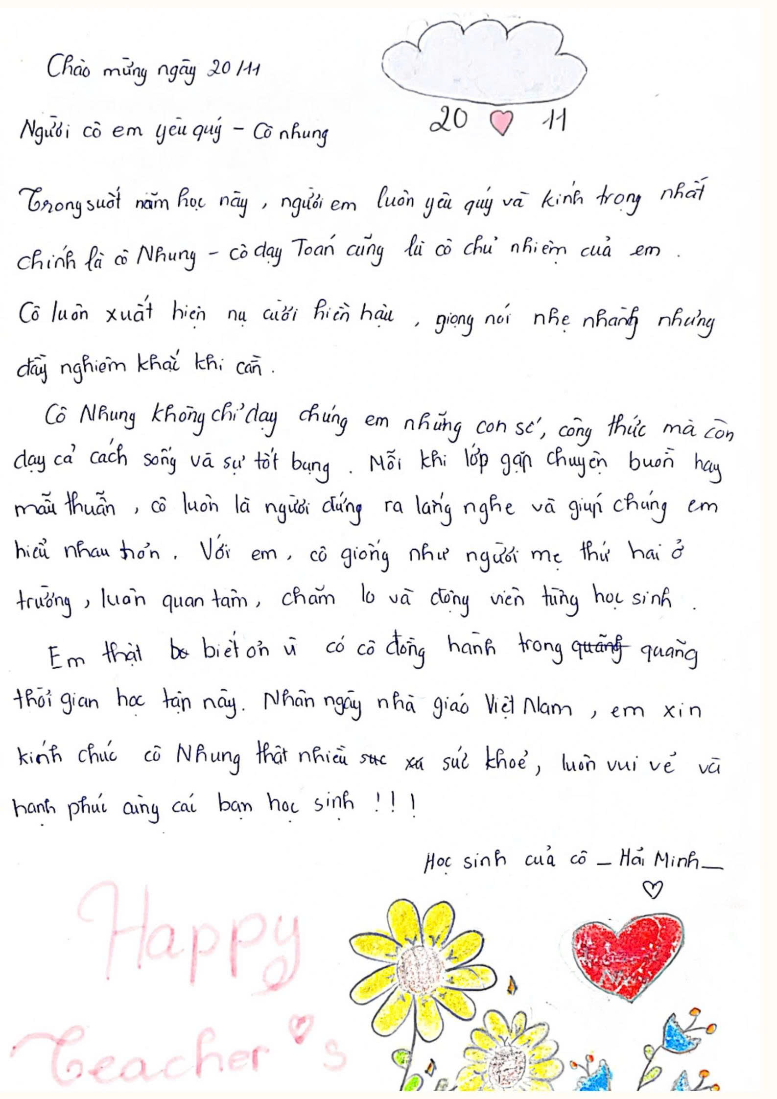 Em thật sự biết ơn vì cô đã đồng hành trong quãng thời gian học tập này. Nhân ngày Nhà giáo Việt Nam, em xin kính chúc cô Nhung thật nhiều sức khỏe, luôn vui vẻ và hạnh phúc cùng các bạn học sinh!!!