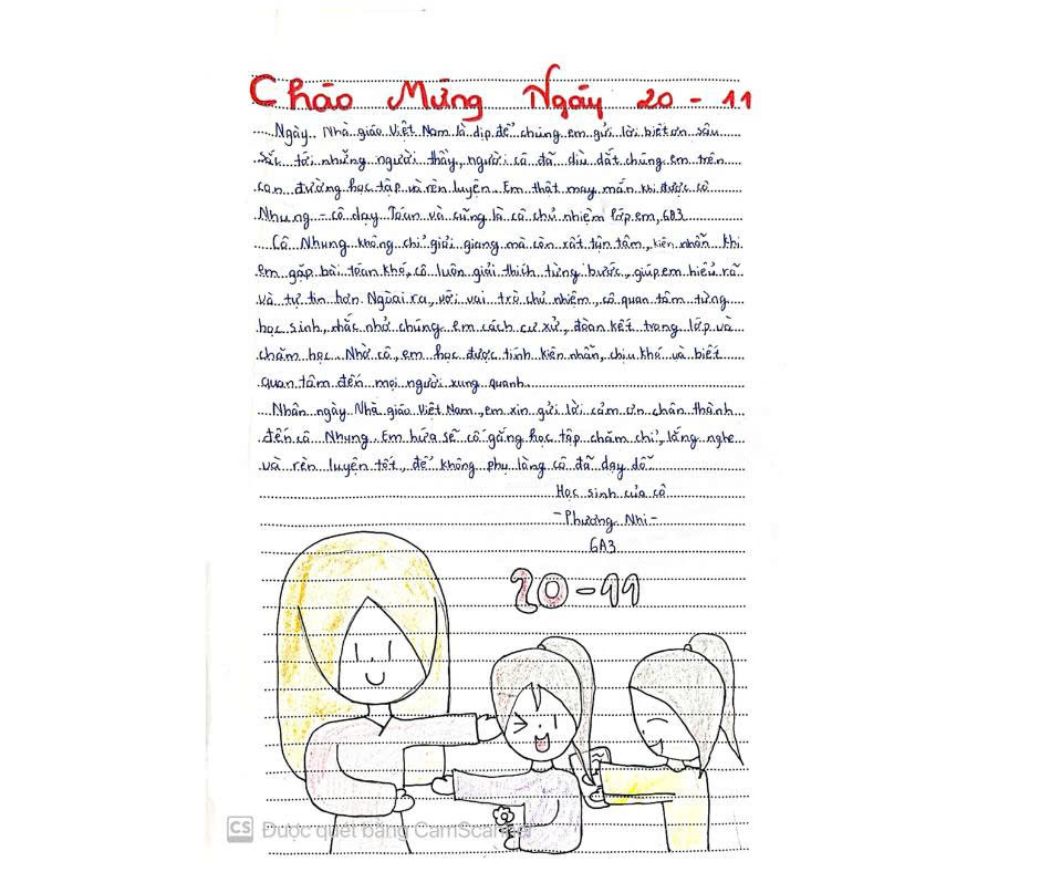 Nhân ngày Nhà giáo Việt Nam, em xin gửi lời cảm ơn chân thành đến cô Nhung. Em hứa sẽ cố gắng học tập chăm chỉ, lắng nghe và rèn luyện tốt để không phụ lòng cô đã dạy dỗ.