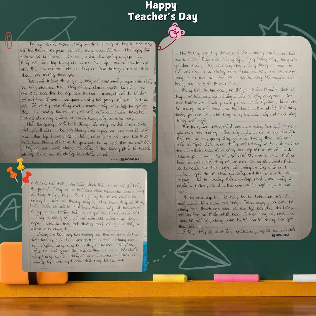 Dưới mái trường thân yêu, thầy cô như những ngọn nến nhỏ, soi sáng cho học trò. Thầy cô như những người lái đò, chịu khó đưa bao thế hệ cập bến tri thức. Trong chuyến đò đó đã có biết bao kỉ niệm thân quen, những bài giảng say sưa của thầy cô. Có những hôm thầy mệt, nhưng thầy vẫn tiếp tục giảng dạy. Có những khi cô ốm, cô vẫn cắm cúi chấm từng bài. Tất cả chỉ mong chúng em chăm học, tiến bộ từng ngày.