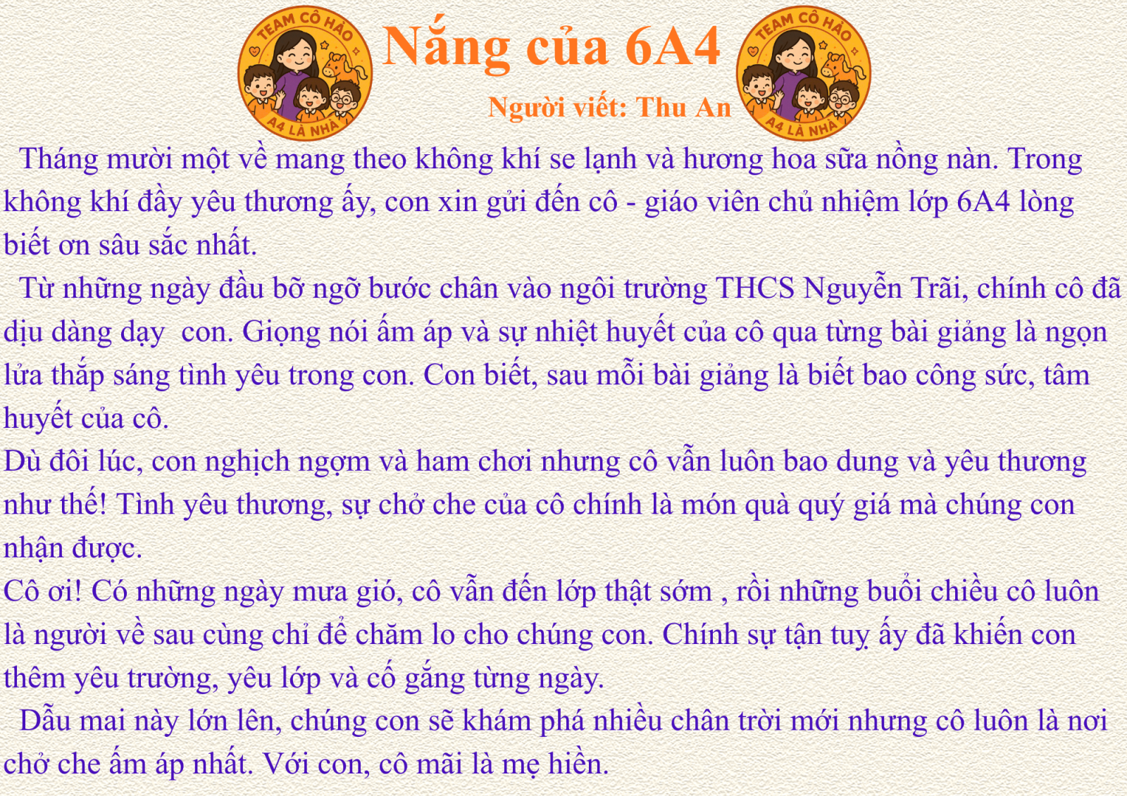 Tháng mười một về mang theo không khí se lạnh và hương hoa sữa nồng nàn. Trong không khí đầy yêu thương ấy, con xin gửi đến cô - giáo viên chủ nhiệm lớp 6A4 lòng biết ơn sâu sắc nhất.