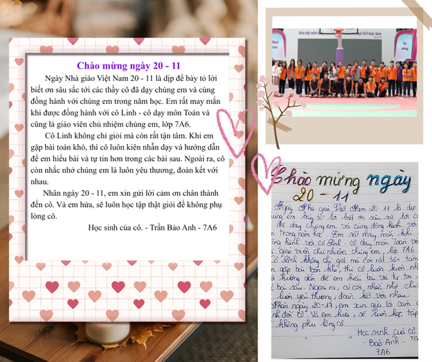 Ngày Nhà giáo Việt Nam 20 - 11 là dịp để bày tỏ lời biết ơn sâu sắc tới các thầy cô đã dạy chúng em và cùng đồng hành với chúng em trong năm học. Em rất may mắn khi được đồng hành với cô Linh - cô dạy môn Toán và cũng là giáo viên chủ nhiệm chúng em, lớp 7A6.