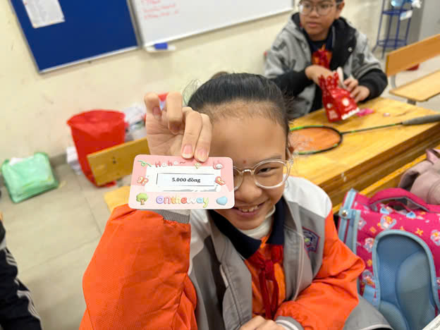 Em vội vàng chạy đến bàn mình, ngồi xuống và háo hức mở chiếc hộp ra. Bên trong là những viên kẹo nhỏ xinh với nhiều màu sắc rực rỡ. Và thật bất ngờ, cô giáo của chúng em còn chuẩn bị cả những chiếc thẻ cào để thử vận may nữa! Em run rẩy cào thử chiếc thẻ của mình và hiện ra dòng chữ: "Merry Christmas!". Nhìn sang mấy bàn bên cạnh, bạn thì trúng 5 nghìn, bạn khác thì trúng 10 nghìn, thậm chí có bạn còn trúng hẳn 15 nghìn! Cả lớp lúc ấy rộn ràng tiếng cười nói, ai nấy đều vui vẻ và hào hứng.