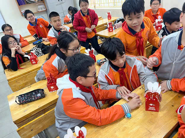 Trên bảng, cô giáo còn dán thêm một tấm bảng nhỏ với dòng chữ: "Merry Christmas! Các con ăn xong nhớ giữ gìn vệ sinh nhé ^^". Một dòng chữ đơn giản nhưng khiến không khí lớp học trở nên thật gần gũi và ấm áp. Chúng em vừa ăn kẹo, vừa ríu rít khoe nhau những điều thú vị, tay thì giữ chặt những thẻ cào như một món quà may mắn.