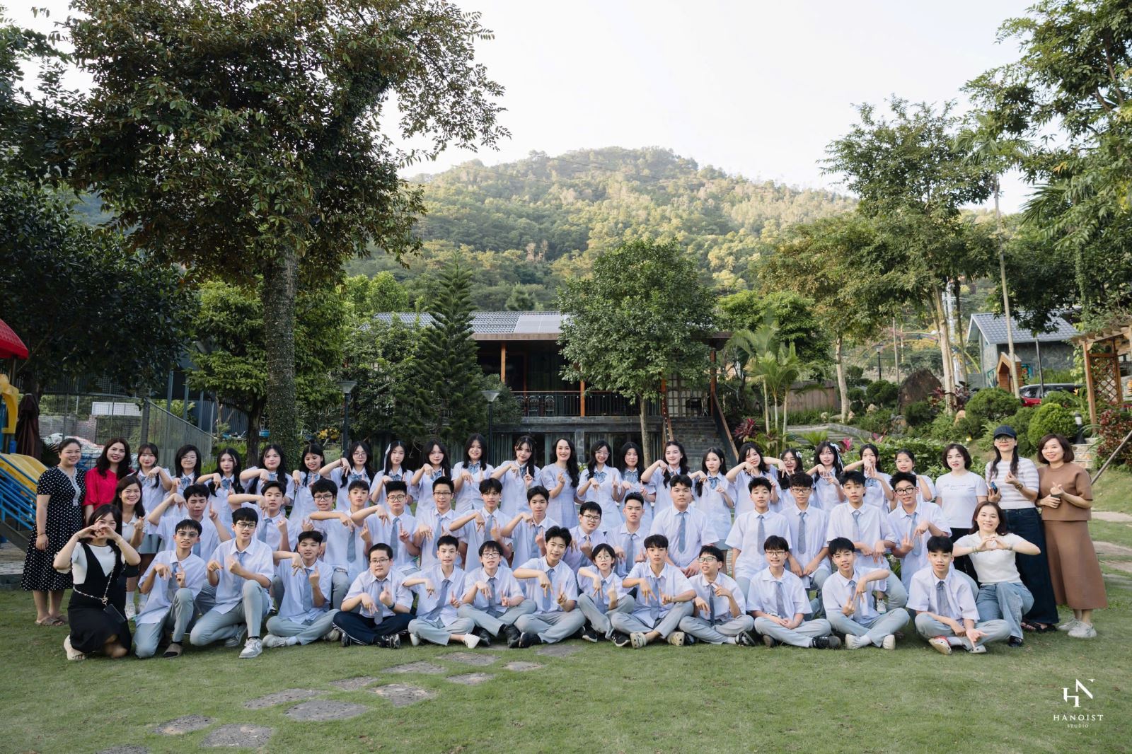 Tiếp đó, chúng em lên lớp để chụp cùng 2 cô giáo yêu quý. Mỗi bạn được phát cho một tờ giấy để ghi lại ước mơ của mình, bạn thì ghi tên ngôi trường THPT mình thích, bạn thì có những ước mơ lớn lao hơn nhưng đó đều là mong ước các bạn thầm nghĩ bấy lâu. Buổi chụp sáng tuy bận rộn nhưng chúng em vô cùng vui vẻ, các bác Phụ Huynh lớp đã mua cho mỗi người một suất đồ ăn để lấy sức cho điểm chụp tiếp theo. Đặt chân tới Đồng Đò – Sóc Sơn, ai cũng hứng khởi không chỉ vì vẻ đẹp nơi đây mà còn là thời gian cho những bức ảnh với nhóm bạn của mình, mỗi cặp bạn thân có cho mình nhiều kiểu “pose” ngộ nghĩnh hay “cool” ngầu khác nhau.
