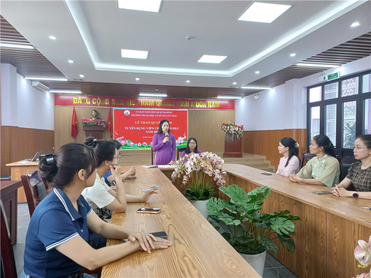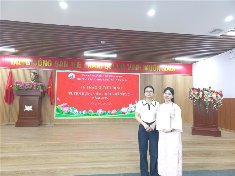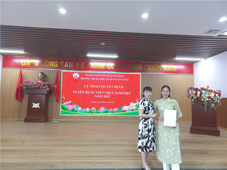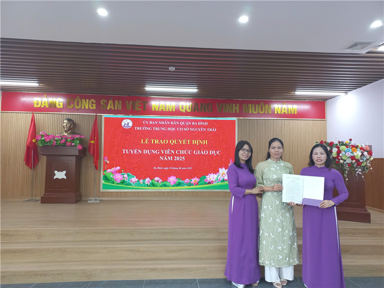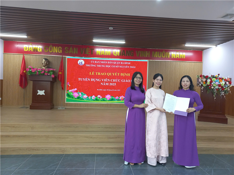 Thực hiện chỉ đạo của Quận Ba Đình, ngày 30/6/2025 Trường THCS Nguyễn Trãi tổ chức lễ trao quyết định tuyển dụng viên chức ngành Giáo dục cho hai đồng chí trúng tuyển trong kỳ thi tuyển viên chức ngành Giáo dục năm học 2024–2025.