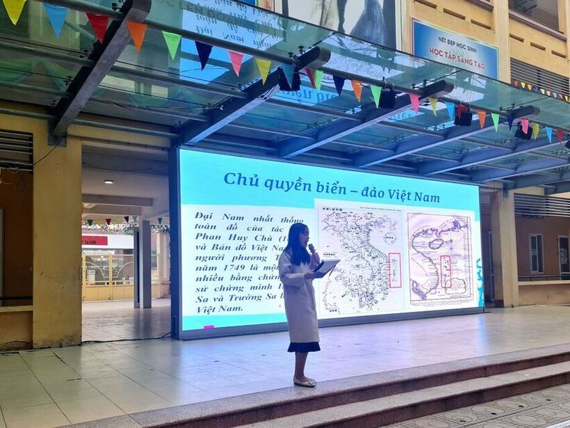Qua phần giới thiệu của cô giáo Nguyễn Thị Huyền - giáo viên bộ môn Lịch sử của trường, các em học sinh hiểu thêm về vẻ đẹp của biển đảo Việt Nam; về tiềm năng kinh tế, chủ quyền biển, hải đảo Việt Nam; về bảo vệ và phát huy giá trị tài nguyên, môi trường biển của đất nước, từ đó mỗi học sinh càng thêm tự hào, xác định rõ trách nhiệm của thế hệ trẻ trong việc bảo vệ chủ quyền đất nước, chủ quyền biển đảo Việt Nam.