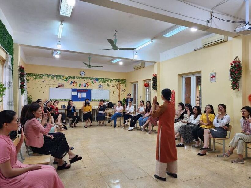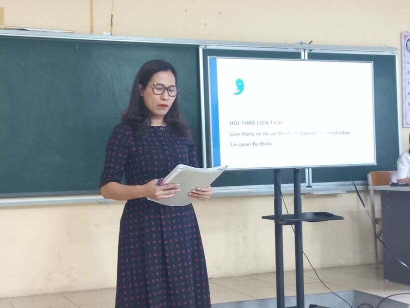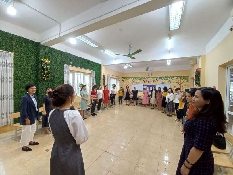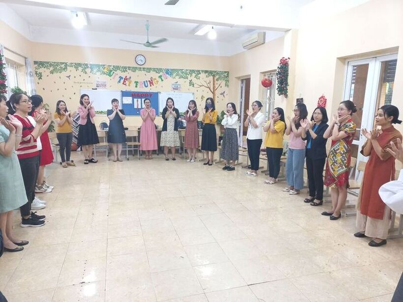 Tiếp theo, cô giáo Đỗ Vi điều phối hoạt động khởi động ngắn – giúp giáo viên hứng khởi, tạo môi trường kích hoạt năng lượng; tạo hứng thú cho buổi chia sẻ.