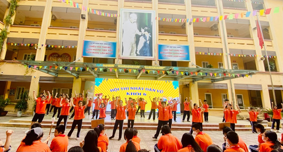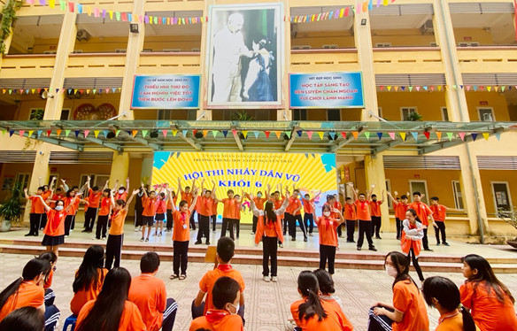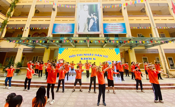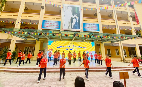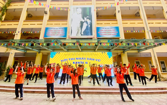 Do đó ở trường THCS Nguyễn Trãi, với mong muốn mọi hoạt động đều hướng tới đáp ứng nhu cầu tâm lí lứa tuổi học sinh, tạo không khí vui tươi, hứng khởi, các thầy cô giáo đã có sáng kiến thay thế bài thể dục chung bằng bài nhảy dân vũ, và tổ chức thi đua giữa các khối lớp.