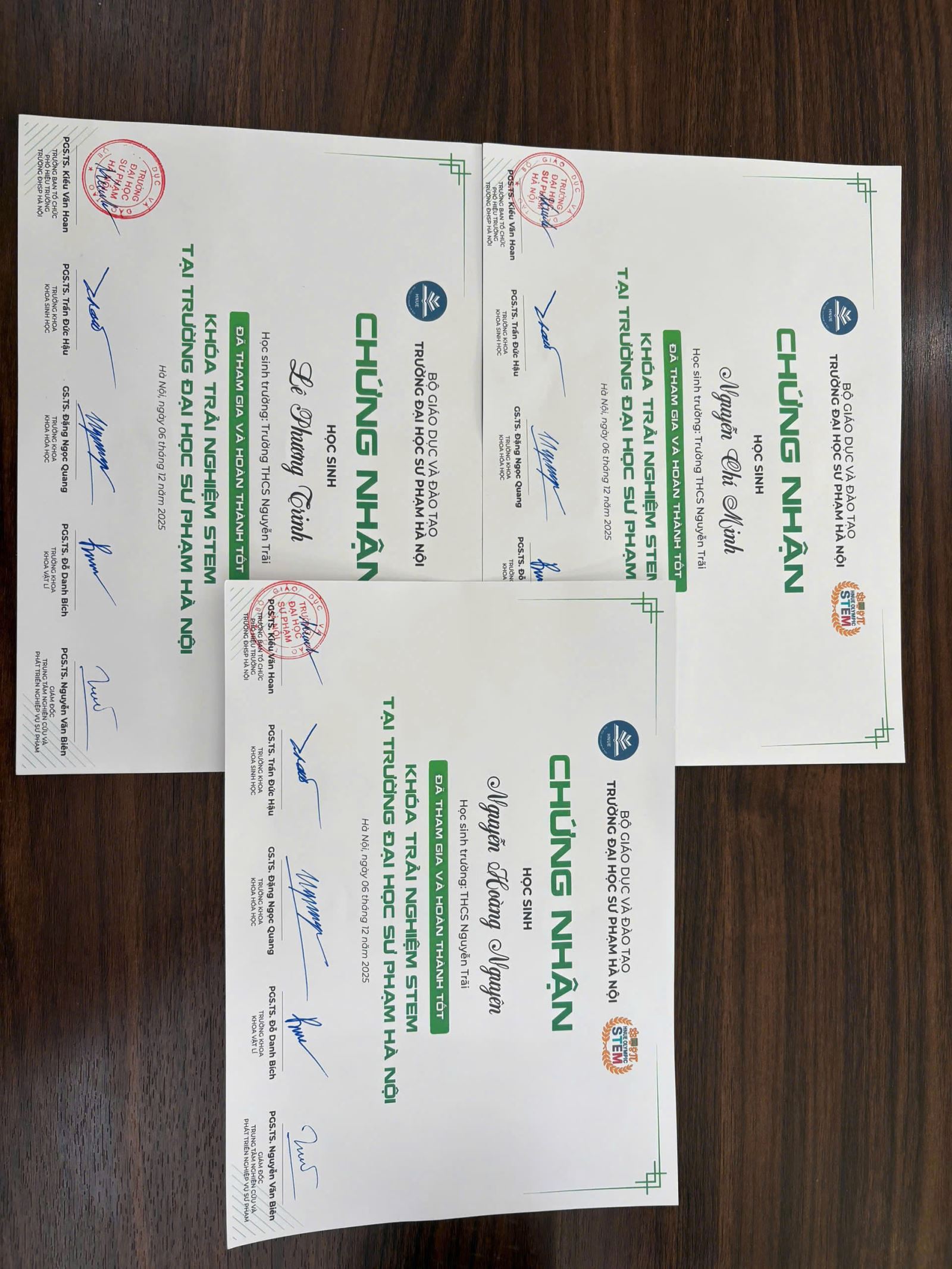 Bằng sự nỗ lực bền bỉ, tinh thần làm việc nhóm xuất sắc và phong thái trình bày tự tin, đội tuyển đã được Ban tổ chức trao Giấy chứng nhận tham dự vòng Bán kết HNUE Olympic STEM 2025. Đây là sự ghi nhận xứng đáng cho hành trình học hỏi nghiêm túc và sáng tạo không ngừng của các con.