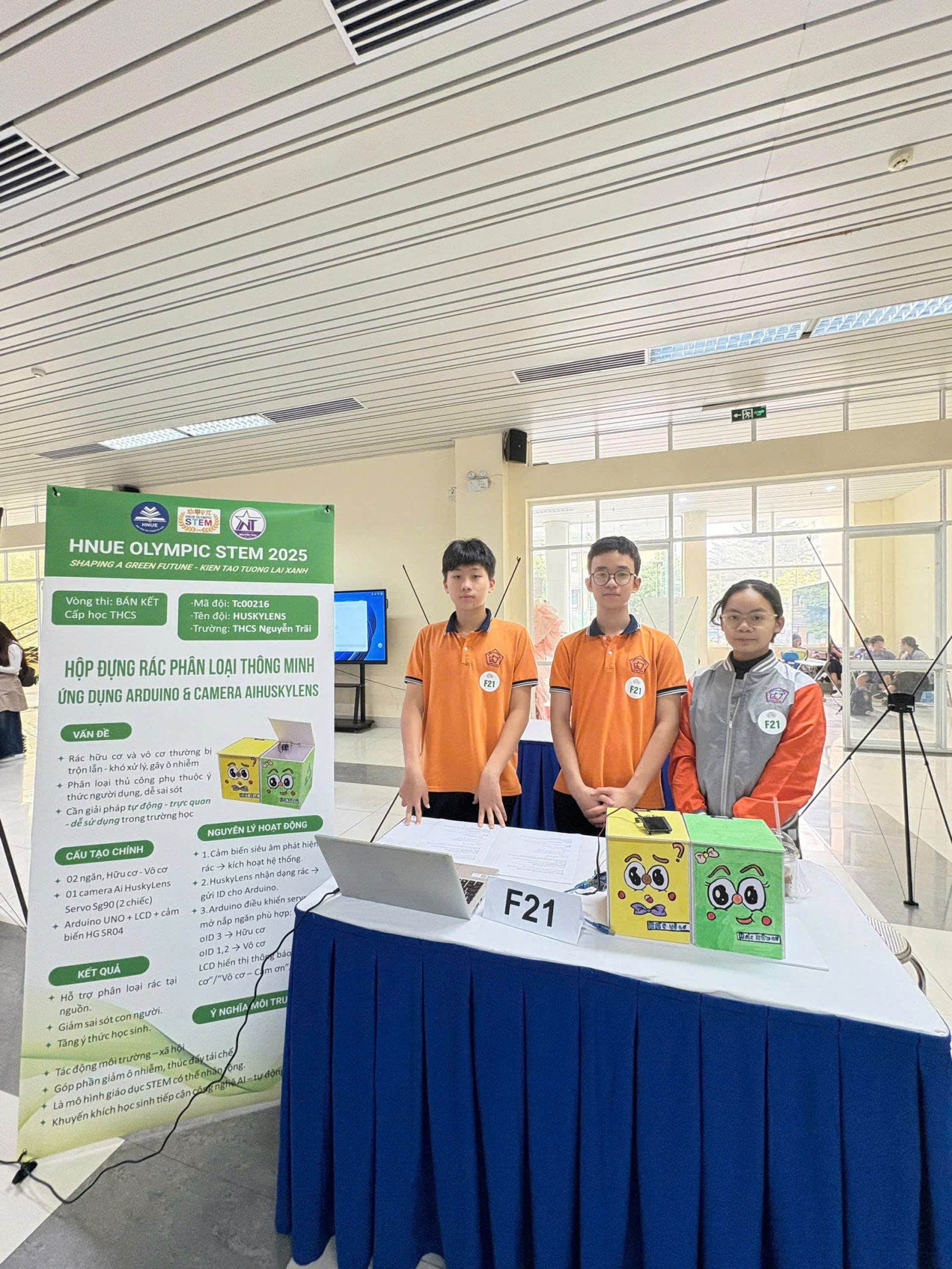 Đội thi mang đến dự án: “Hộp đựng rác phân loại thông minh ứng dụng Arduino và trí tuệ nhân tạo (AI)”. Sản phẩm không chỉ cho thấy khả năng vận dụng kiến thức công nghệ mà còn thể hiện rõ trách nhiệm với môi trường – một trong những vấn đề lớn của thời đại. Với hệ thống cảm biến tự động, AI nhận diện chất thải và cơ chế phân loại chính xác, sản phẩm đã nhận được nhiều đánh giá tích cực về tính ứng dụng, khả năng mở rộng và ý nghĩa giáo dục.
