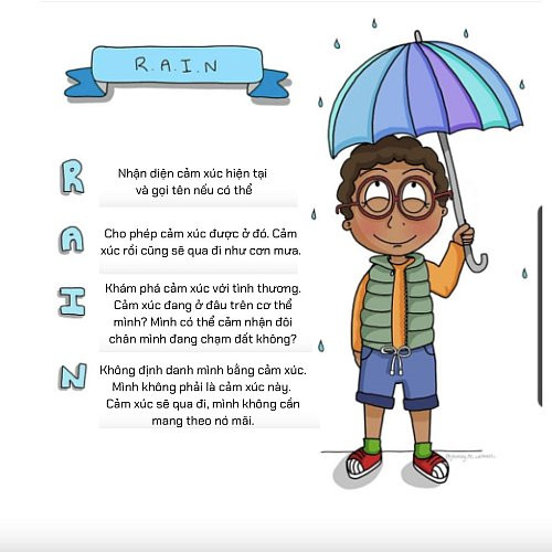 RAIN là một từ viết tắt được tạo thành bởi các chữ cái đầu trong 4 bước thực hành nuôi dưỡng lòng thấu cảm với chính mình: