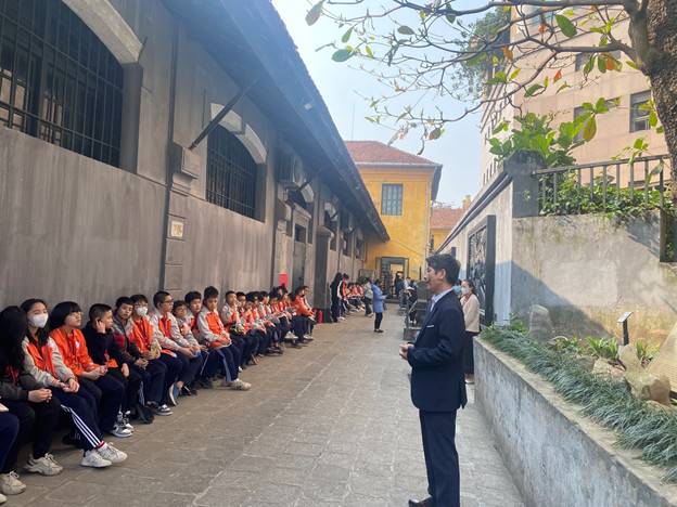 Sau khi tham dự lễ dâng hương, giáo viên và học sinh được nghe cán bộ di tích giới thiệu lịch sử và lắng nghe thuyết minh về kiến trúc và kết cấu bên trong nhà tù Hỏa Lò.