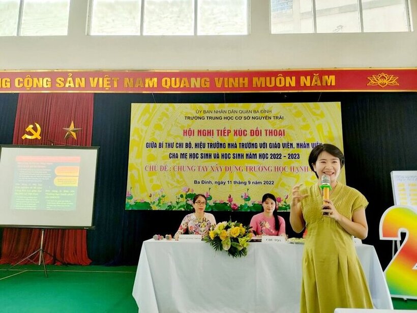 Trong lời phát biểu khai mạc, cô giáo Lê Hoàn Châu - Bí thư chi bộ, Hiệu trưởng nhấn mạnh mục đích, ý nghĩa của việc xây dựng Trường học Hạnh phúc ở trường THCS Nguyễn Trãi; xác định được UBND quận Ba Đình lựa chọn triển khai thí điểm Dự án này giai đoạn 2022-2025 vừa là niềm vui nhưng cũng vừa là nhiệm vụ rất khó khăn của tập thể CBGVNV và học sinh nhà trường.