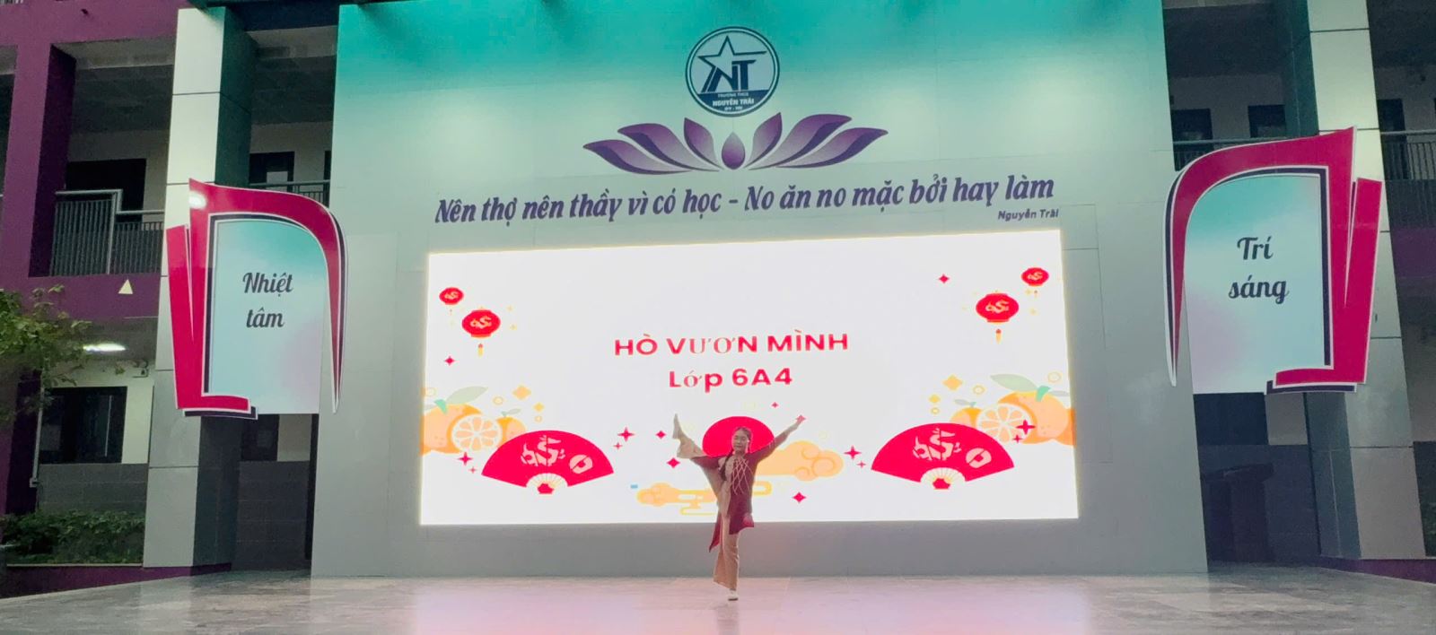 Điểm nhấn đầy ấn tượng của chương trình là tiết mục múa trên nền nhạc ca khúc “Hò vươn mình” do em Lê Thùy Chi – học sinh lớp 6A4 biểu diễn. Màn trình diễn sôi động, giàu cảm xúc đã mang đến làn gió tươi mới, thể hiện tinh thần trẻ trung, tự tin và nhận được những tràng pháo tay cổ vũ nồng nhiệt từ thầy cô và học sinh toàn trường.