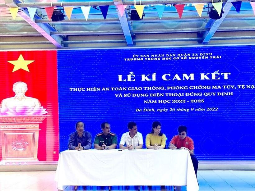 Ngày 26/9, tại Trường Trung học cơ sở Nguyễn Trãi (quận Ba Đình, Hà Nội), diễn ra lễ ký cam kết thực hiện an toàn giao thông, phòng chống ma túy, tệ nạn xã hội và sử dụng điện thoại đúng qui định năm học 2022 – 2023.