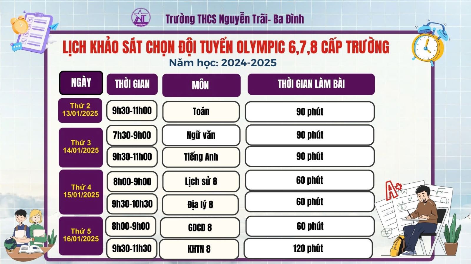 Lịch khảo sát chọn đội tuyển Olympic 6,7,8 cấp trường năm học 2024 - 2025