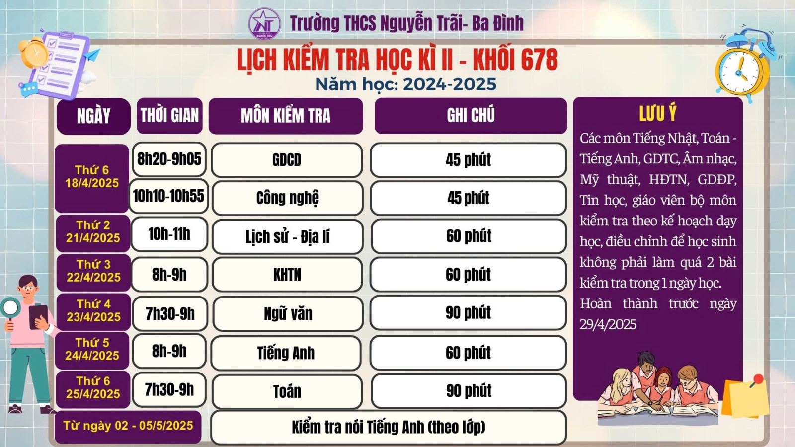 Lịch kiểm tra học kì II - khối 678 năm học 2024 - 2025 cụ thể: