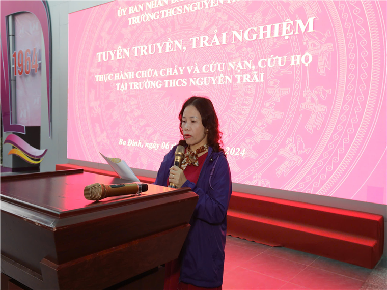 Mở đầu chương trình, cô Lê Thị Minh Huệ - Bí thư Chi bộ, Hiệu trưởng nhà trường đã lên phát biểu khai mạc. Cô nhấn mạnh: “Trong các trường học hiện nay, ngoài việc giảng dạy, trau dồi kiến thức học vấn thì còn cần trang bị đầy đủ các kiến thức và kỹ năng sống cho các em học sinh, giúp các em nhận biết rõ hơn về các vấn đề trong xã hội mà điển hình là kỹ năng cơ bản về PCCC, kỹ năng thoát nạn khi có cháy nổ hoặc sự cố xảy ra… để từ đó khi gặp tình huống tương tự trong cuộc sống các em có thể tự cứu lấy bản thân và người khác. Và trường THCS Nguyễn Trãi đặc biệt quan tâm tới việc trang bị kỹ năng này cho học sinh”.