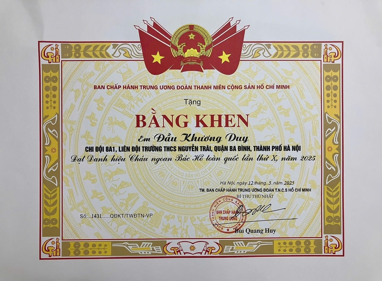 Câu chuyện về hành trình phấn đấu của em Đầu Khương Duy là một nguồn cảm hứng lớn cho các bạn học sinh khác. Em đã chứng minh rằng, với sự nỗ lực, kiên trì và một trái tim hướng thiện, mỗi người đều có thể đạt được những thành công đáng tự hào. Danh hiệu Cháu ngoan Bác Hồ toàn quốc mà em vinh dự nhận được không chỉ là một phần thưởng cá nhân mà còn là một lời khẳng định về những giá trị tốt đẹp mà trường THCS Nguyễn Trãi luôn hướng tới: giáo dục toàn diện, bồi dưỡng nhân cách và phát triển tiềm năng của mỗi học sinh. Trong những năm học tiếp theo, tin rằng em Đầu Khương Duy sẽ tiếp tục giữ vững ngọn lửa nhiệt huyết, không ngừng học hỏi, rèn luyện và lan tỏa những giá trị tốt đẹp đến cộng đồng. Em sẽ mãi là niềm tự hào của gia đình, nhà trường và là một tấm gương sáng cho các bạn học sinh noi theo trên con đường trở thành những công dân có ích cho xã hội. Xin chúc mừng em Đầu Khương Duy với danh hiệu cao quý này! Chúc em luôn gặt hái được nhiều thành công hơn nữa trên con đường học tập và rèn luyện.