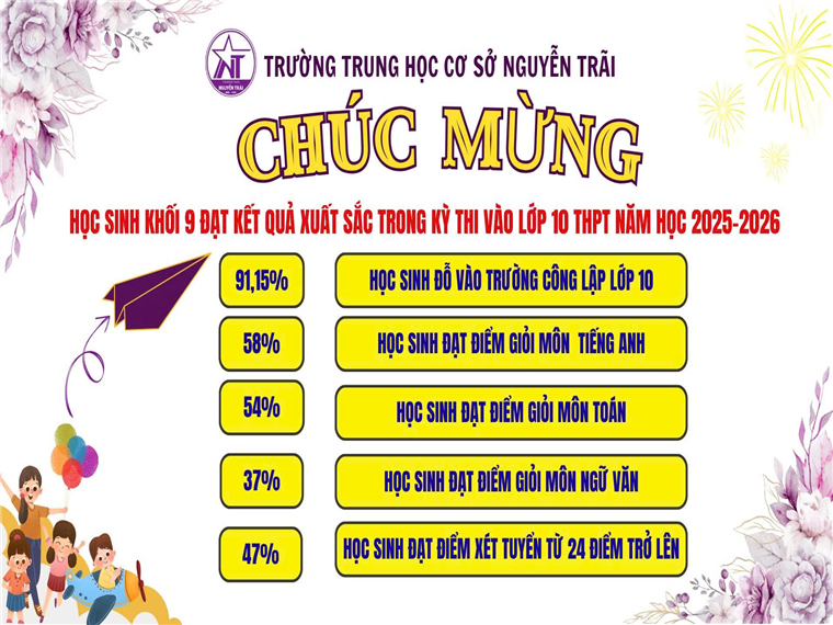 Kỳ thi vào lớp 10 THPT năm học 2025–2026 khép lại, mang theo bao niềm vui vỡ òa từ những trái ngọt đầu mùa của thầy trò Trường THCS Nguyễn Trãi. Những con số biết nói của khoá học sinh đầu tiên theo chương trình GDPT mới 2018- không chỉ là kết quả của một kỳ thi, mà còn là minh chứng sống động cho hành trình nỗ lực bền bỉ, tinh thần “Nhiệt tâm - Trí sáng” mà thầy cô và các em học sinh đã cùng nhau gây dựng suốt những năm tháng vừa qua!
