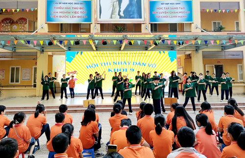 Ở trường THCS Nguyễn Trãi, với mong muốn mọi hoạt động đều hướng tới đáp ứng nhu cầu tâm lí lứa tuổi học sinh, tạo không khí vui tươi, hứng khởi, các thầy cô giáo đã có sáng kiến thay thế bài thể dục chung bằng bài nhảy dân vũ.