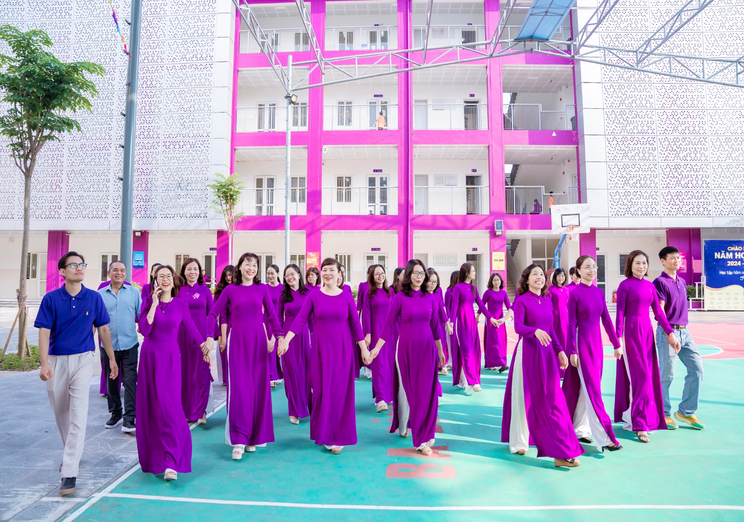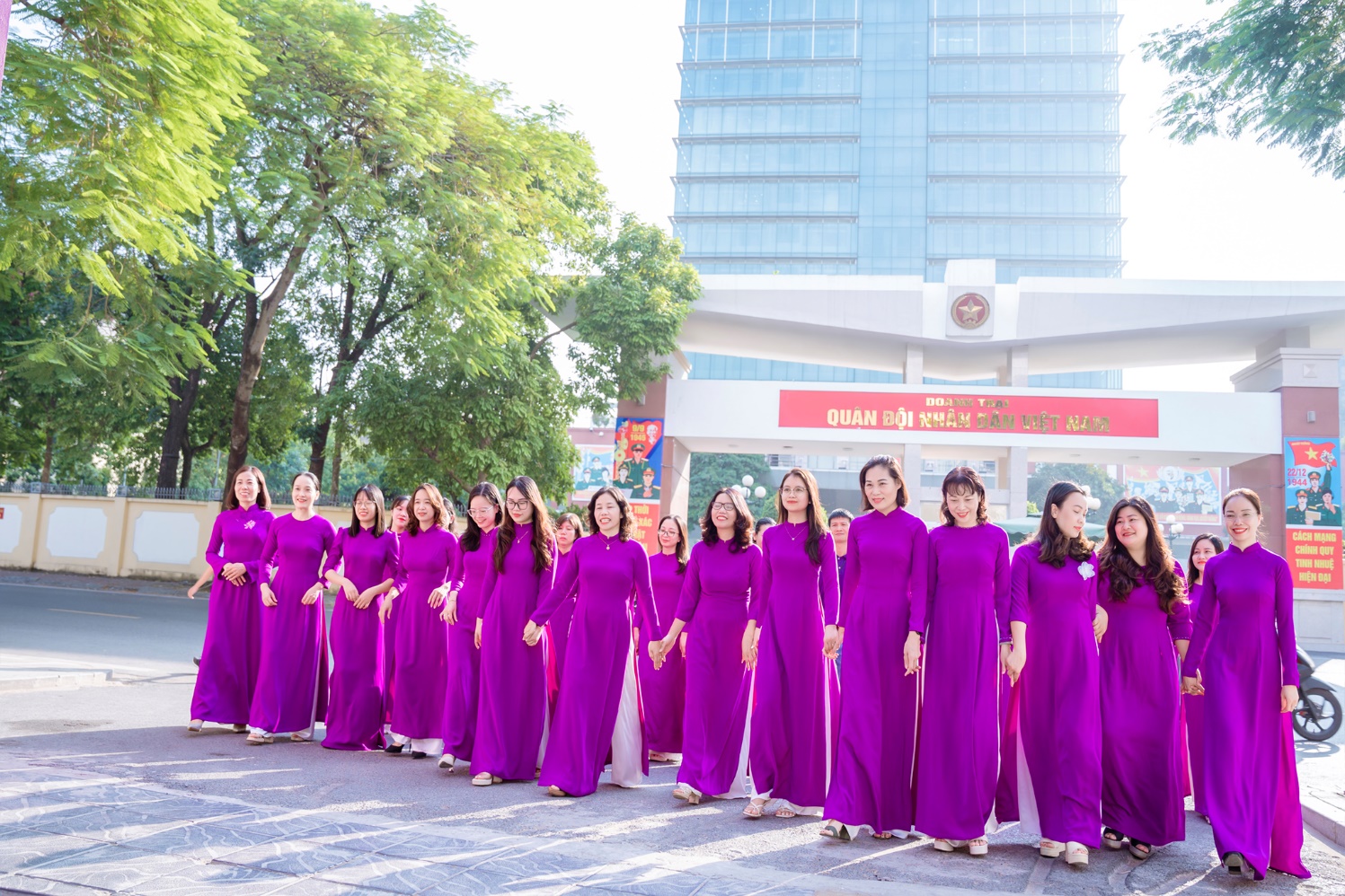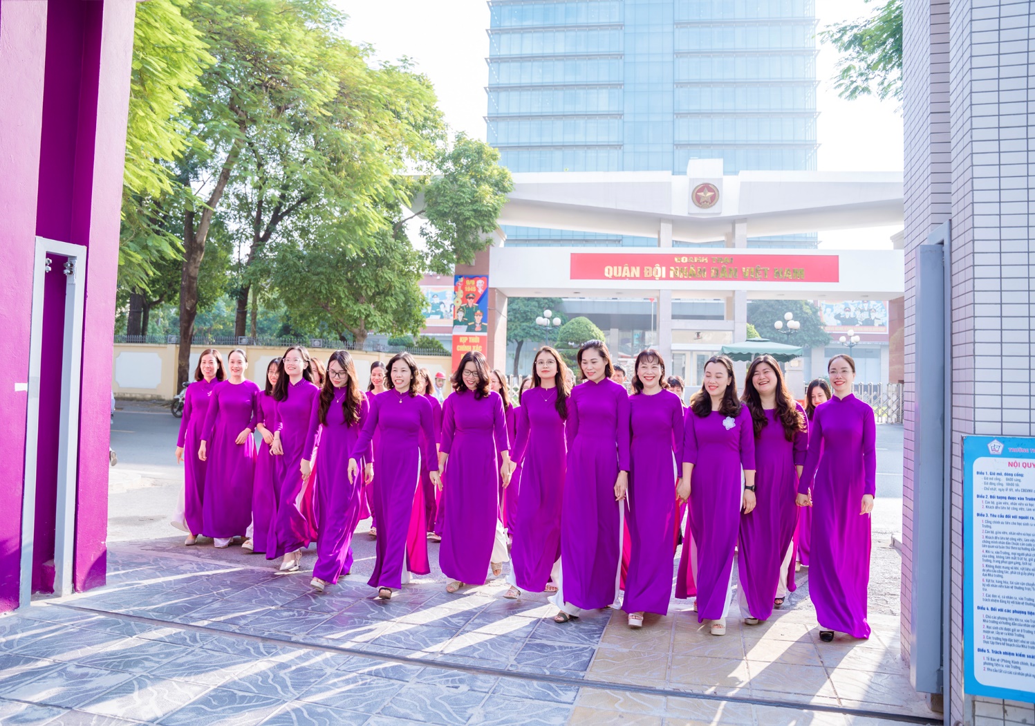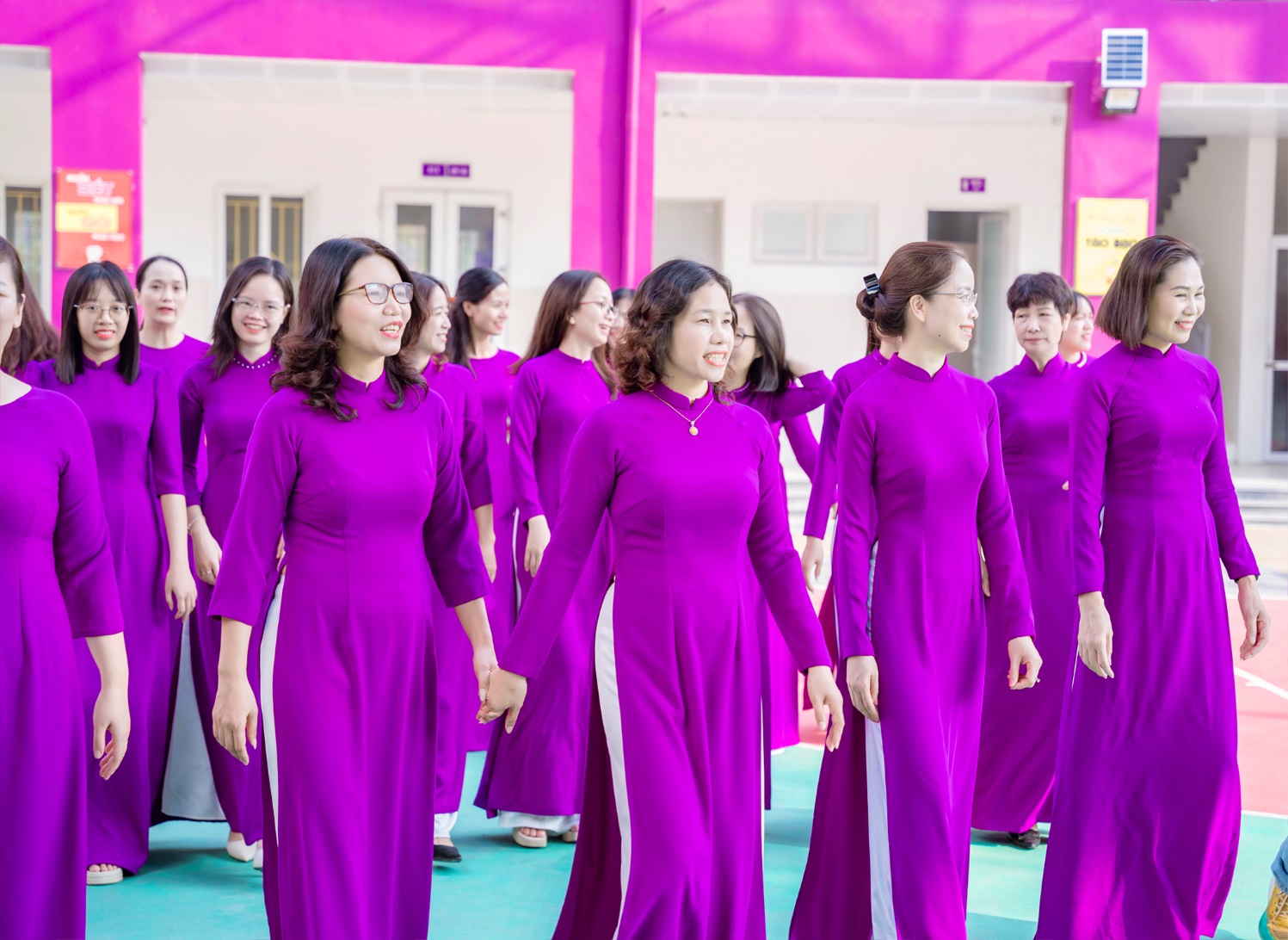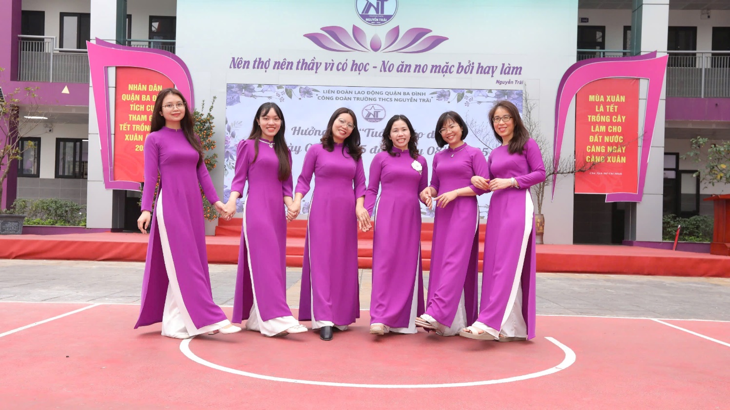 Trong những ngày này, hình ảnh các cô giáo trường THCS Nguyễn Trãi duyên dáng trong tà áo dài tím thướt tha đã trở nên quen thuộc trên bục giảng và dưới sân. Sắc tím tượng trưng cho sự chung thủy, dịu dàng, đồng thời cũng thể hiện sự mạnh mẽ, kiên cường của người phụ nữ Việt Nam.