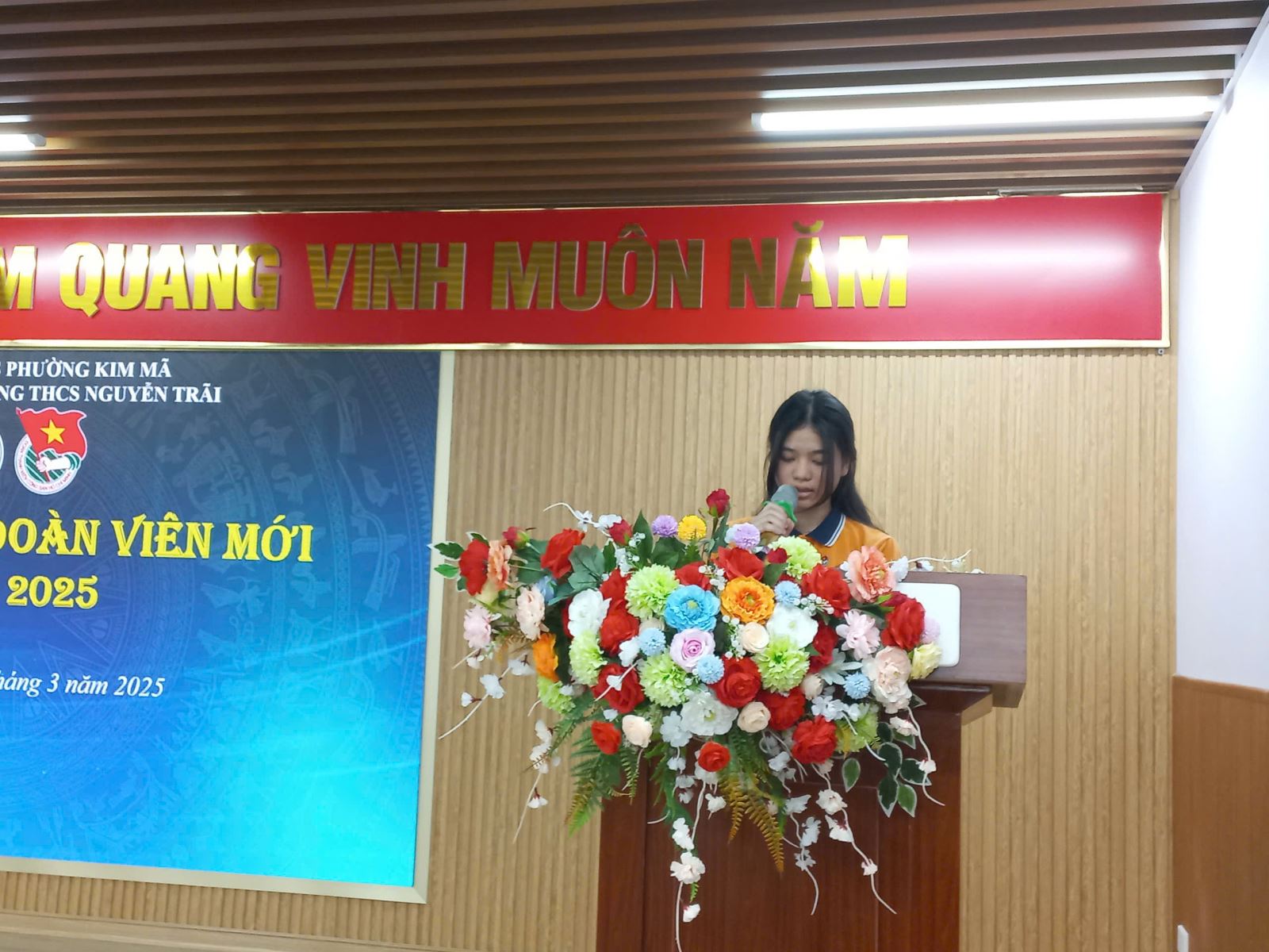 Trong không khí trang trọng của buổi lễ, học sinh Lê Nguyễn Hoàng Linh, lớp 9A2, đại diện cho 21 đoàn viên mới, đã đọc lời hứa của người đoàn viên, thể hiện tinh thần quyết tâm phấn đấu, rèn luyện theo lý tưởng của Đoàn TNCS Hồ Chí Minh, góp phần xây dựng phong trào Đoàn vững mạnh.