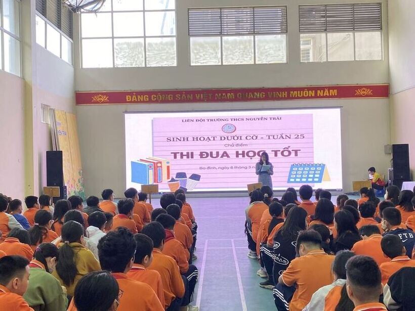 Tiết sinh hoạt dưới cờ đầu tuần ở trường THCS Nguyễn Trãi chiều ngày 6/3/2023 với chủ điểm "Thi đua học tốt" nằm trong đợt thi đua cao điểm chào mừng kỉ niệm 60 năm phong trào "Nghìn việc tốt".