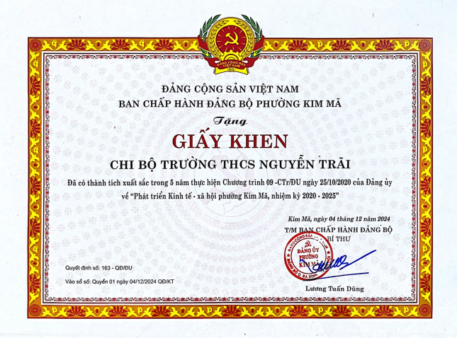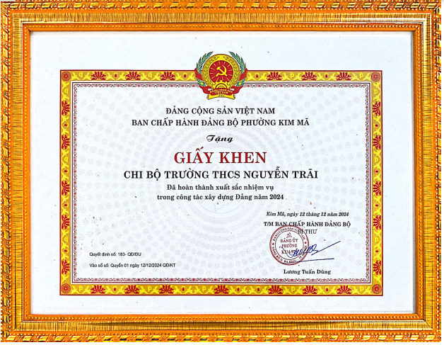 Giấy khen đã có thành tích xuất sắc trong 5 năm thực hiện Chương trình 09-Ctr/ĐU ngày 25/10/2020 của Đảng về “Phát triển Kinh tế-xã hội phường Kim Mã, nhiệm kì 2020-2025”. Trong 5 năm qua, Chi bộ trường THCS Nguyễn Trãi đã có sự phát triển mạnh mẽ và luôn đồng hành cùng với địa phương trong phát triển kinh tế-xã hội.