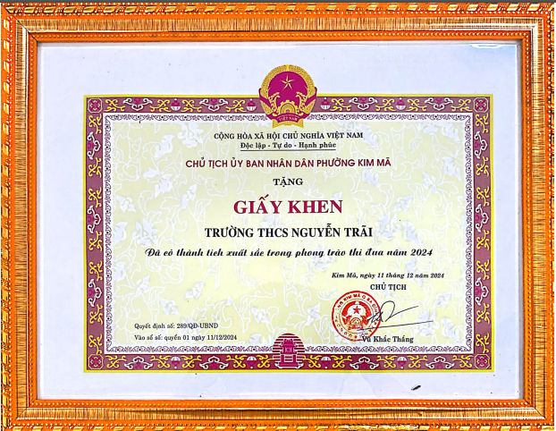 Giấy khen đã có thành tích xuất sắc trong phong trào thi đua năm 2024 cũng khẳng định vị thế của Chi bộ trường THCS Nguyễn Trãi trong các phong trào thi đua của nhà trường và địa phương.