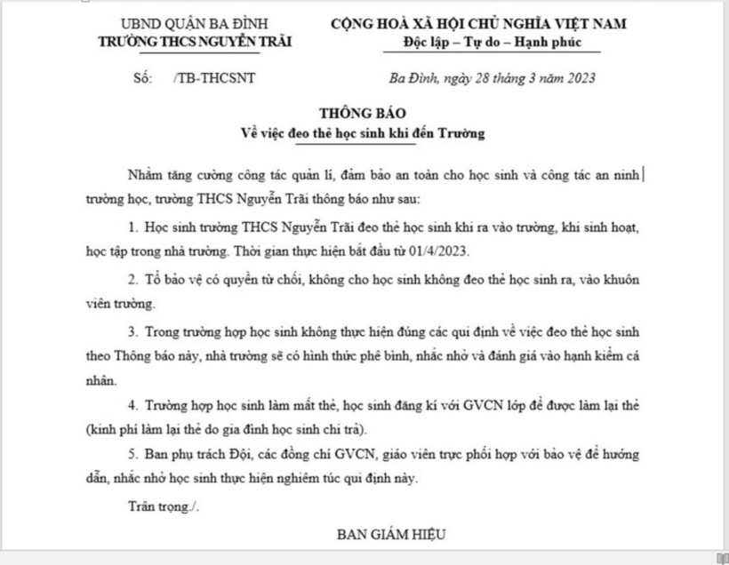 Thông báo: Về việc đeo thẻ học sinh khi đến Trường