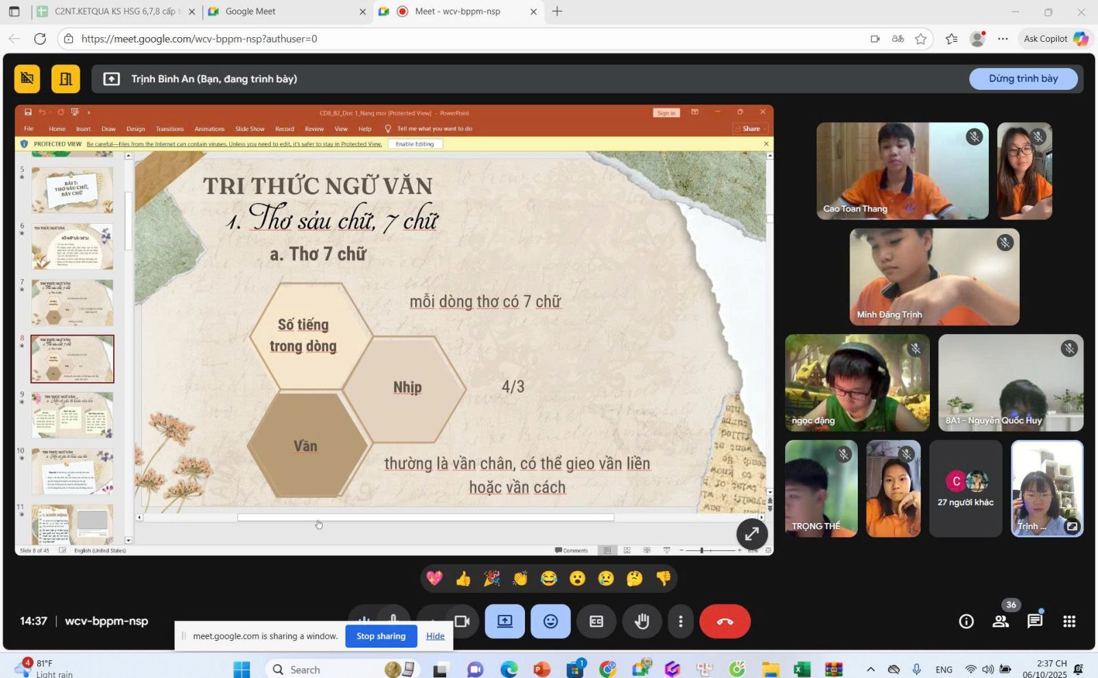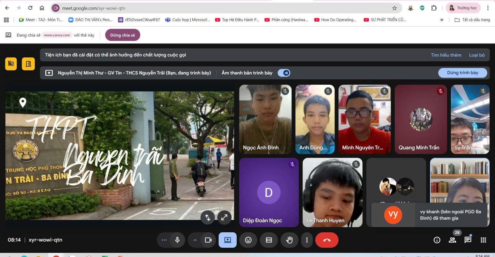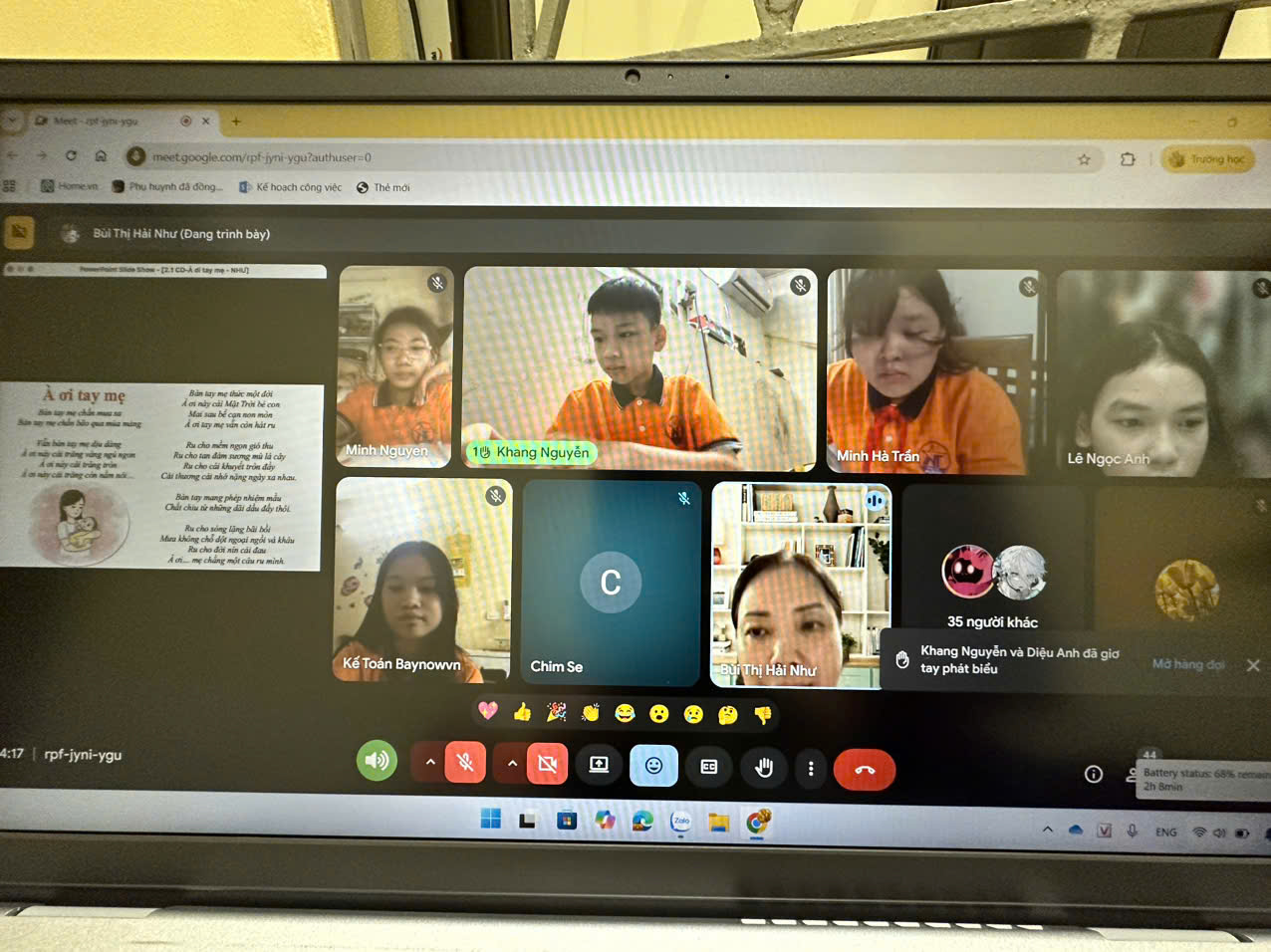 Một giờ học Ngữ văn của cô và trò 8A1   Trong quá trình triển khai, BGH luôn theo sát, chỉ đạo kịp thời; giáo viên phát huy tinh thần trách nhiệm, chủ động thích ứng; phụ huynh học sinh đồng hành, hỗ trợ con em chuẩn bị điều kiện học tập trực tuyến đầy đủ; học sinh nghiêm túc, tích cực tham gia học tập. Nhờ sự phối hợp đồng bộ và tinh thần hợp tác cao, các tiết học trực tuyến trong hai ngày 06 và 07/10 đã được hiệu quả cao, đảm bảo mục tiêu “tạm dừng đến trường nhưng không dừng việc học”.