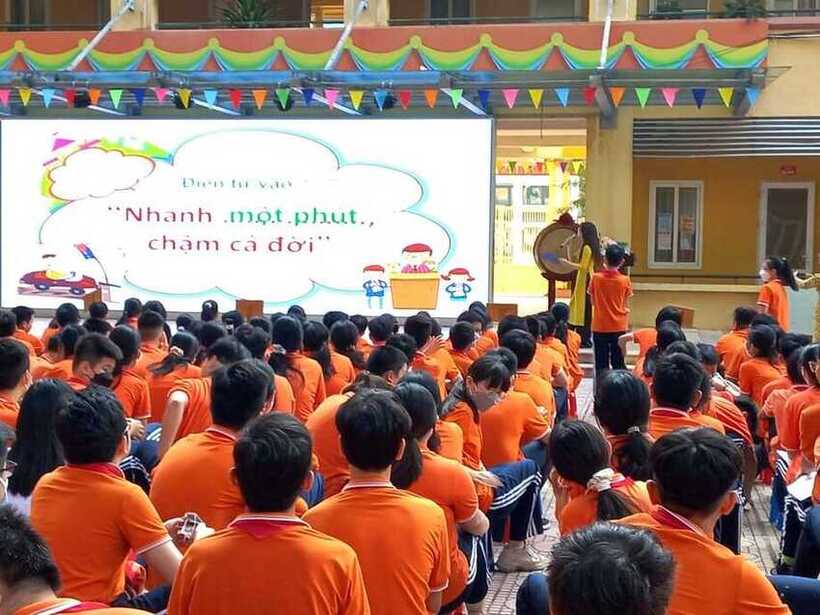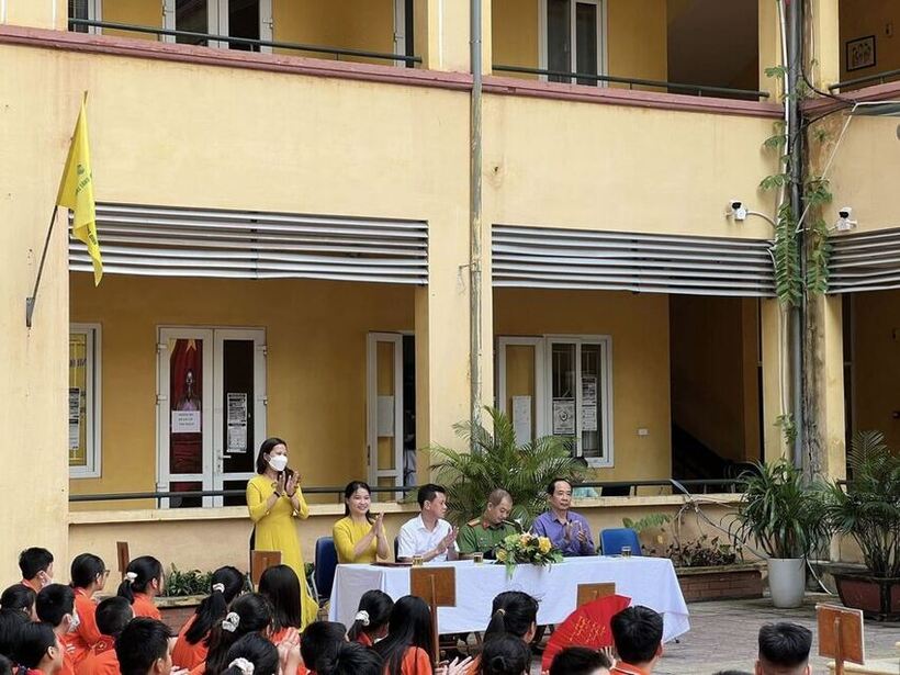 Ngay sau đó là lời phát biểu của cô hiệu trưởng Lê Hoàn Châu thể hiện rõ sự quyết tâm của thầy trò trường THCS Nguyễn Trãi trong việc chấp hành tốt các quy định của phát luật về an toàn giao thông, phòng chống ma túy, tệ nạn xã hội.