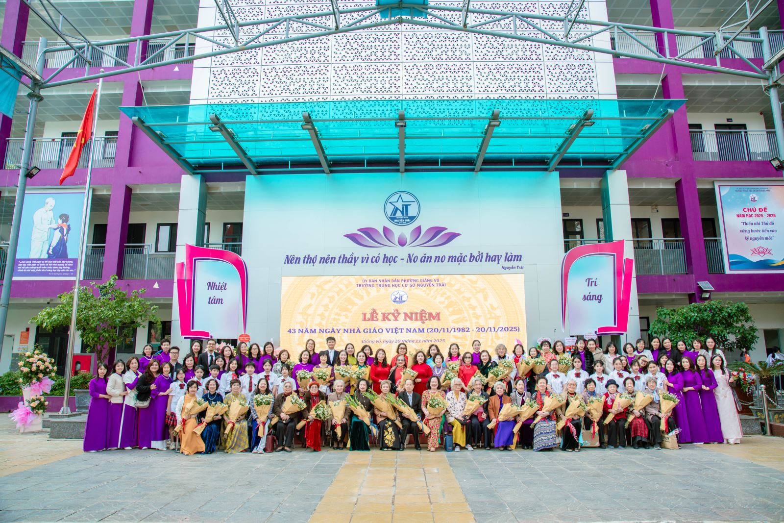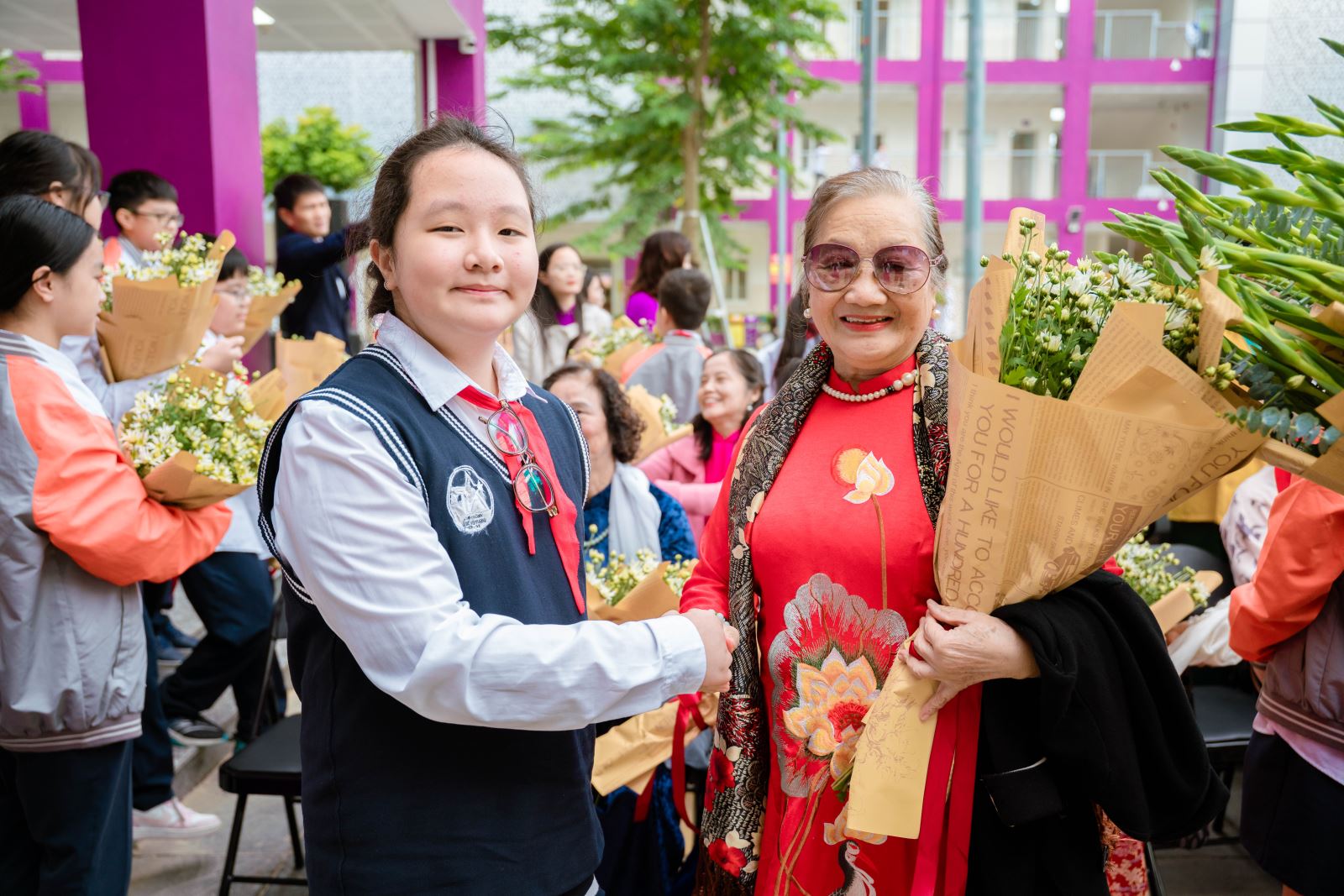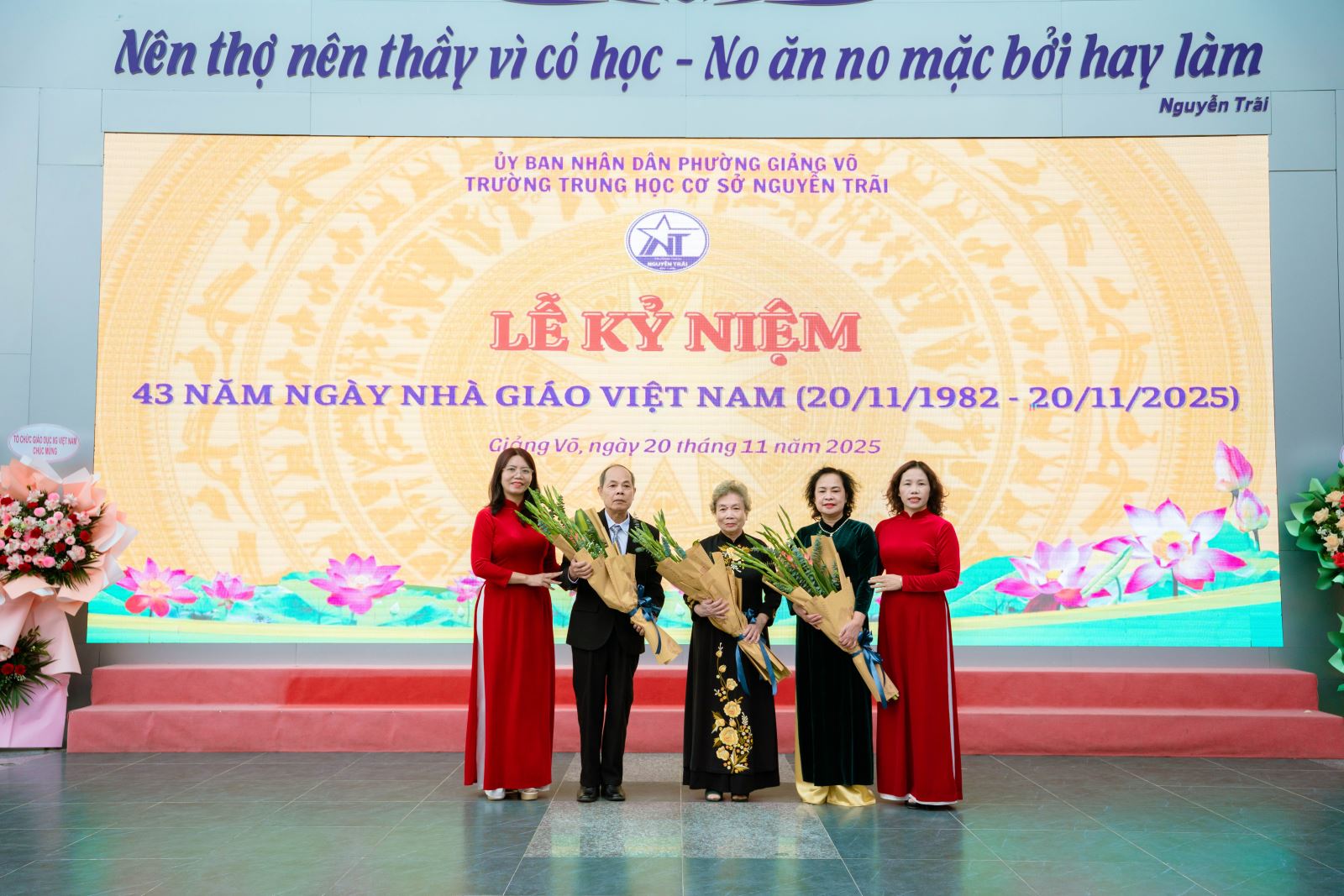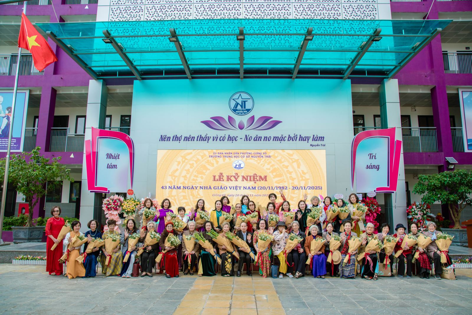 Buổi lễ trở nên trang trọng hơn khi Ban giám hiệu, các con học sinh đã trao tặng những bó hoa tri ân tới các cựu giáo chức – những người đã dành trọn tâm huyết và tuổi trẻ cho sự nghiệp giáo dục của nhà trường. Khoảnh khắc những mái tóc bạc được đón nhận sự kính trọng của thế hệ hôm nay đã tạo nên hình ảnh đẹp và đầy xúc động.