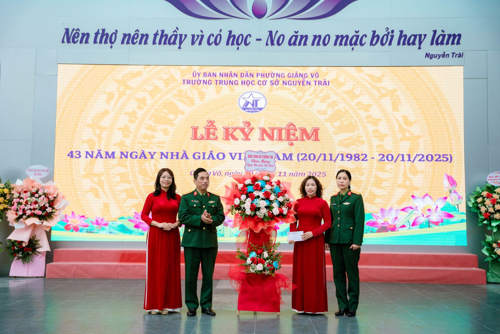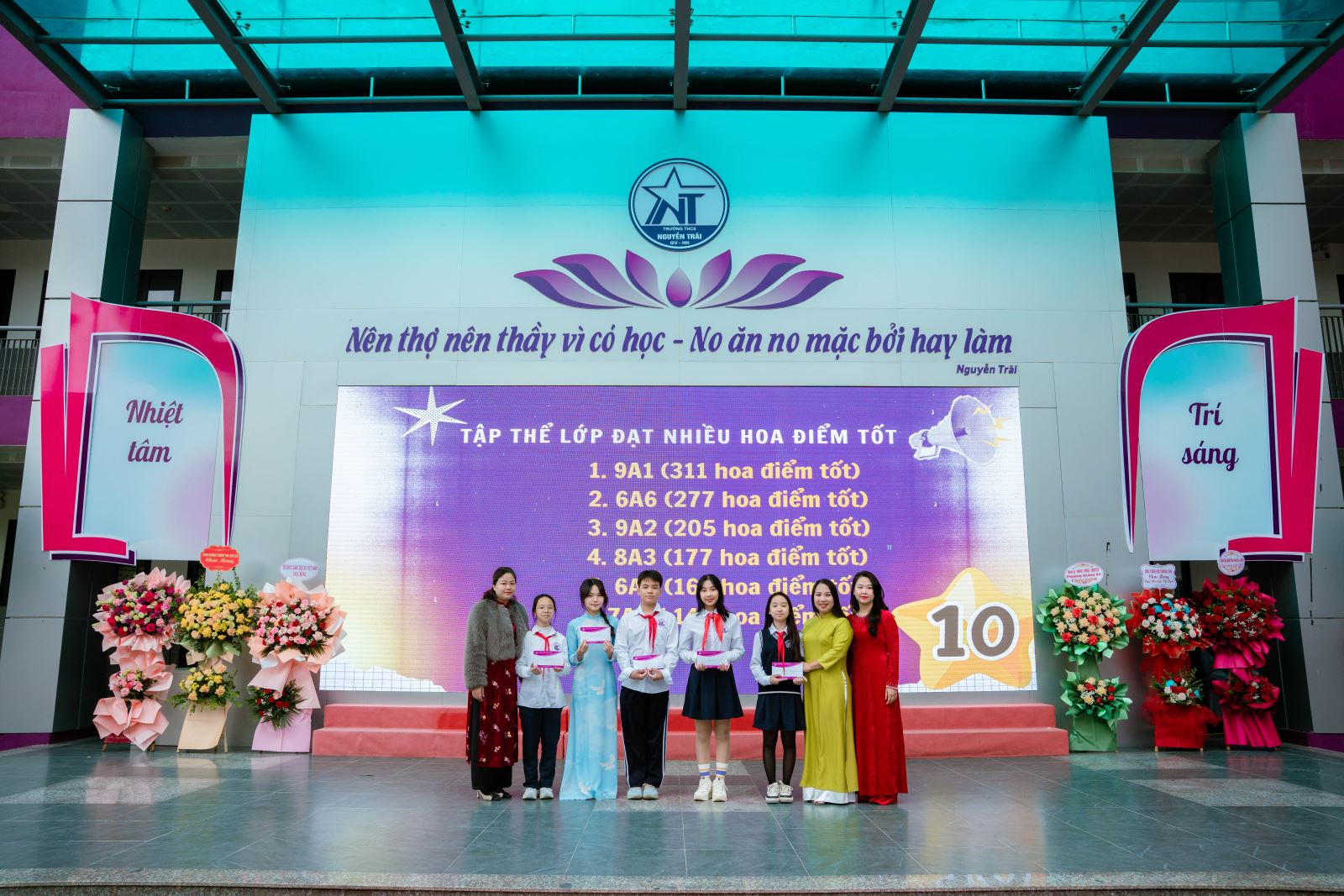 Cũng tại sự kiện, đại diện các đơn vị kết nghĩa, Ban đại diện cha mẹ học sinh đã lên sân khấu tặng hoa chúc mừng nhà trường. Những bó hoa tươi thắm là lời chúc mừng, là niềm tin gửi gắm vào sự phát triển bền vững của Trường THCS Nguyễn Trãi trong giai đoạn mới.