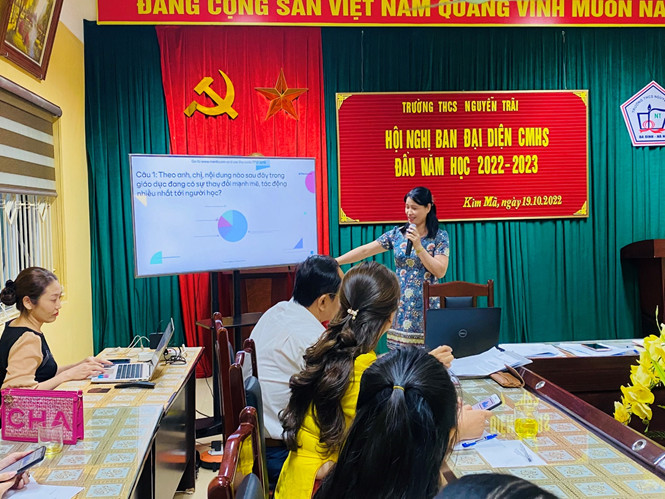 Năm học 2022 – 2023 cũng là năm đầu tiên trường THCS Nguyễn Trãi được chọn là một trong ba trường thí điểm xây dựng mô hình Trường học hạnh phúc của quận Ba Đình, vì vậy, buổi họp cũng được mở đầu khác biệt so với mọi năm. Chị Trần Thanh Loan – phụ trách dự án, đã đặt ra những câu hỏi vô cùng thân thương tới các bậc phụ huynh như một hoạt động khởi động nhằm giúp cho buổi họp trở nên cởi mở và gần gũi.