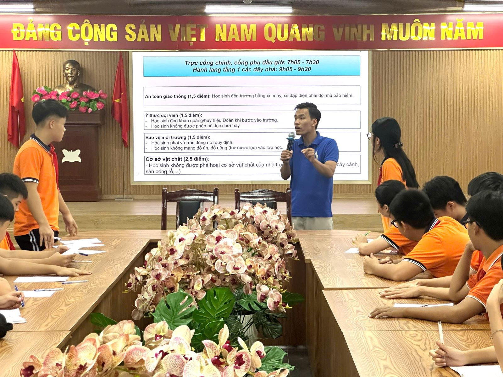 Trong phần đầu chương trình, thầy giáo Lê Đức Toàn đã trực tiếp hướng dẫn đội TNXK cách thức chấm thi đua theo các tiêu chí mới, đảm bảo công bằng, chính xác và khách quan. Thầy nhấn mạnh vai trò gương mẫu, tinh thần trách nhiệm của mỗi đội viên trong việc xây dựng môi trường học tập tích cực, kỷ luật.