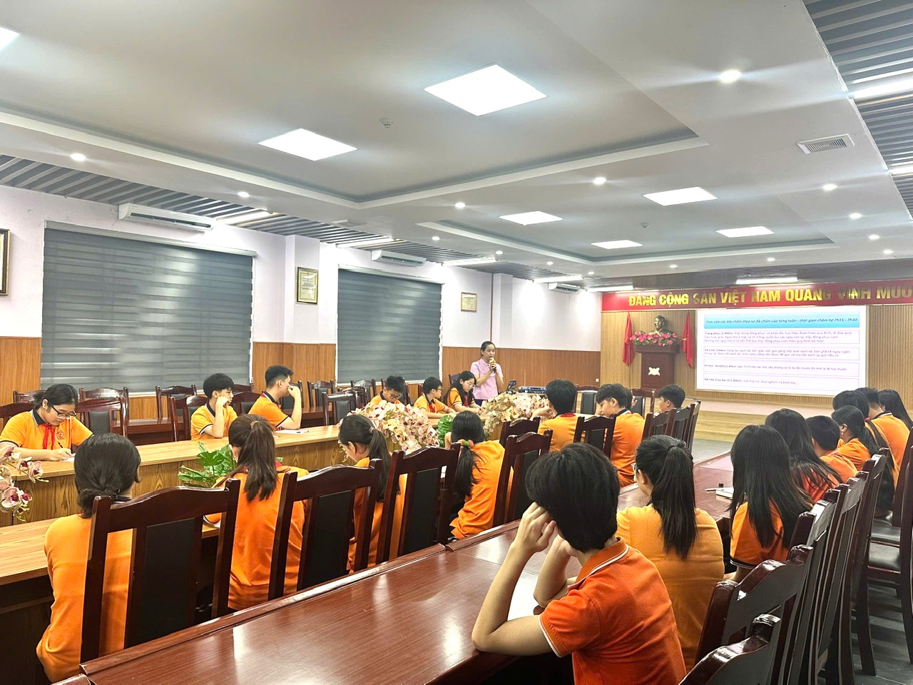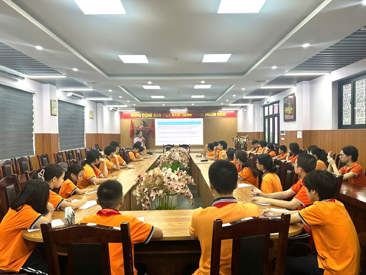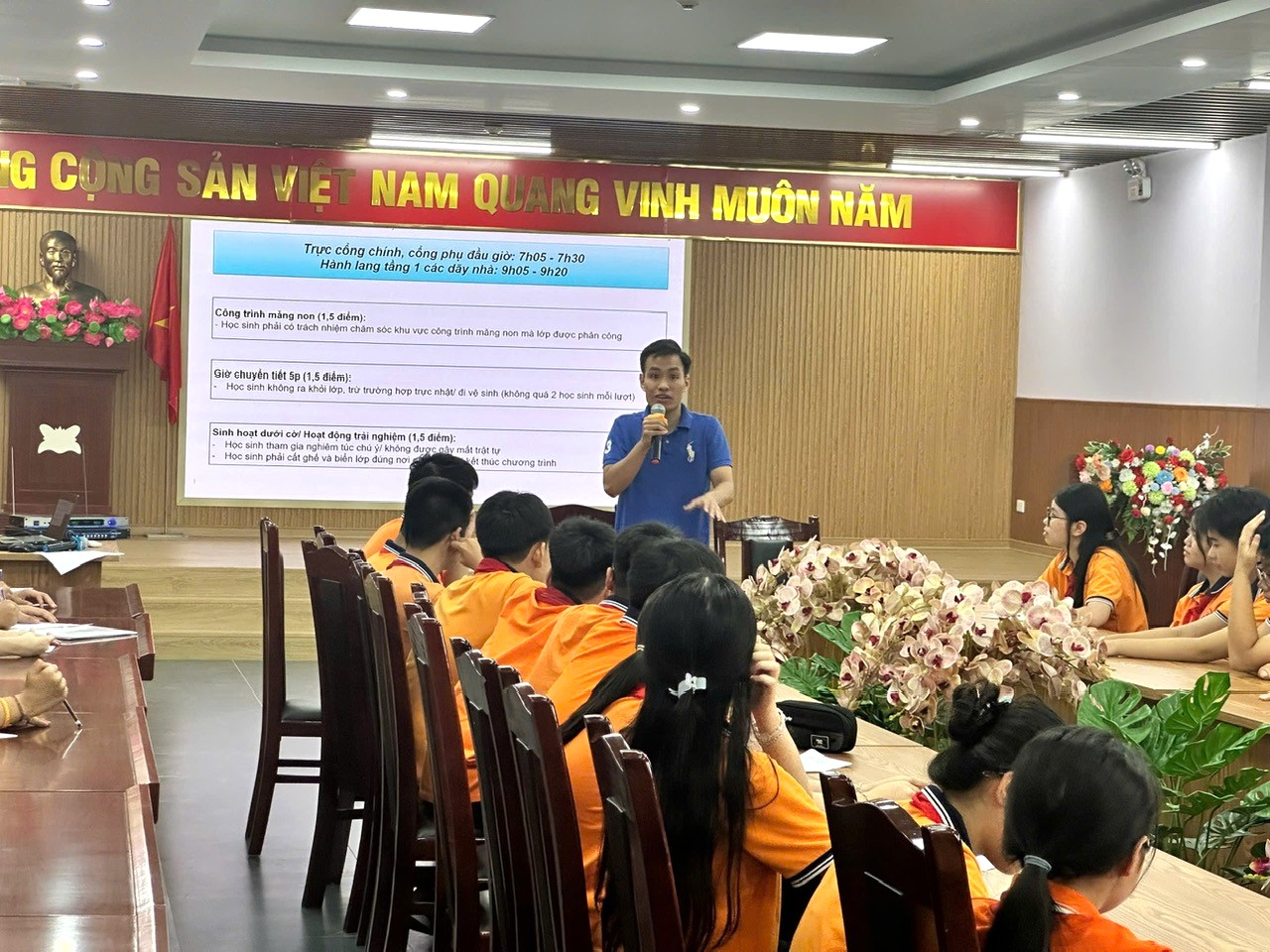 Tiếp nối chương trình, cô giáo TPT Đội Nguyễn Thái Nga đã tập huấn cho đội sao đỏ về quy trình quan sát, ghi chép và đánh giá thi đua trong các khung giờ học tập và sinh hoạt. Cô Nga cũng chia sẻ nhiều tình huống thực tế, giúp các bạn học sinh hiểu rõ vai trò của mình trong việc giữ gìn nền nếp và nội quy trường lớp.